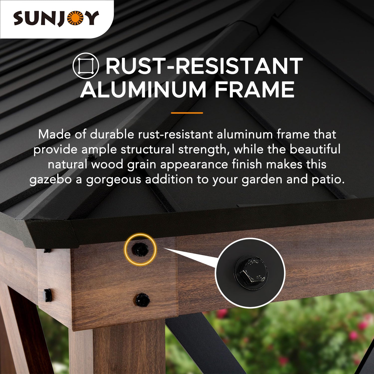 - Spend all four seasons enjoying a covered spot outdoors under the natural wood-looking hardtop gazebo made of rust-proof aluminum frame and galvanized steel roof.