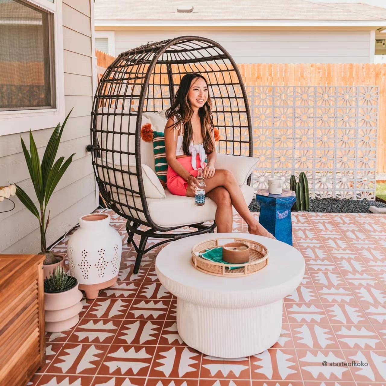 Details: A statement piece for any backyard setting. This modern egg chair from Sunjoy, the world’s leading ready-to-assemble outdoor structure maker is the perfect place to snuggle up with a book or podcast. Its distinct shape can stand on its own in smaller spaces or easily blend into a larger lounge setting. Constructed of all-weather wicker on a powder-coated steel frame with an open weave design. The contemporary chair sits on a swivel base. The thick and removable white cushions are made of weather-resistant fabric that can withstand the seasons.