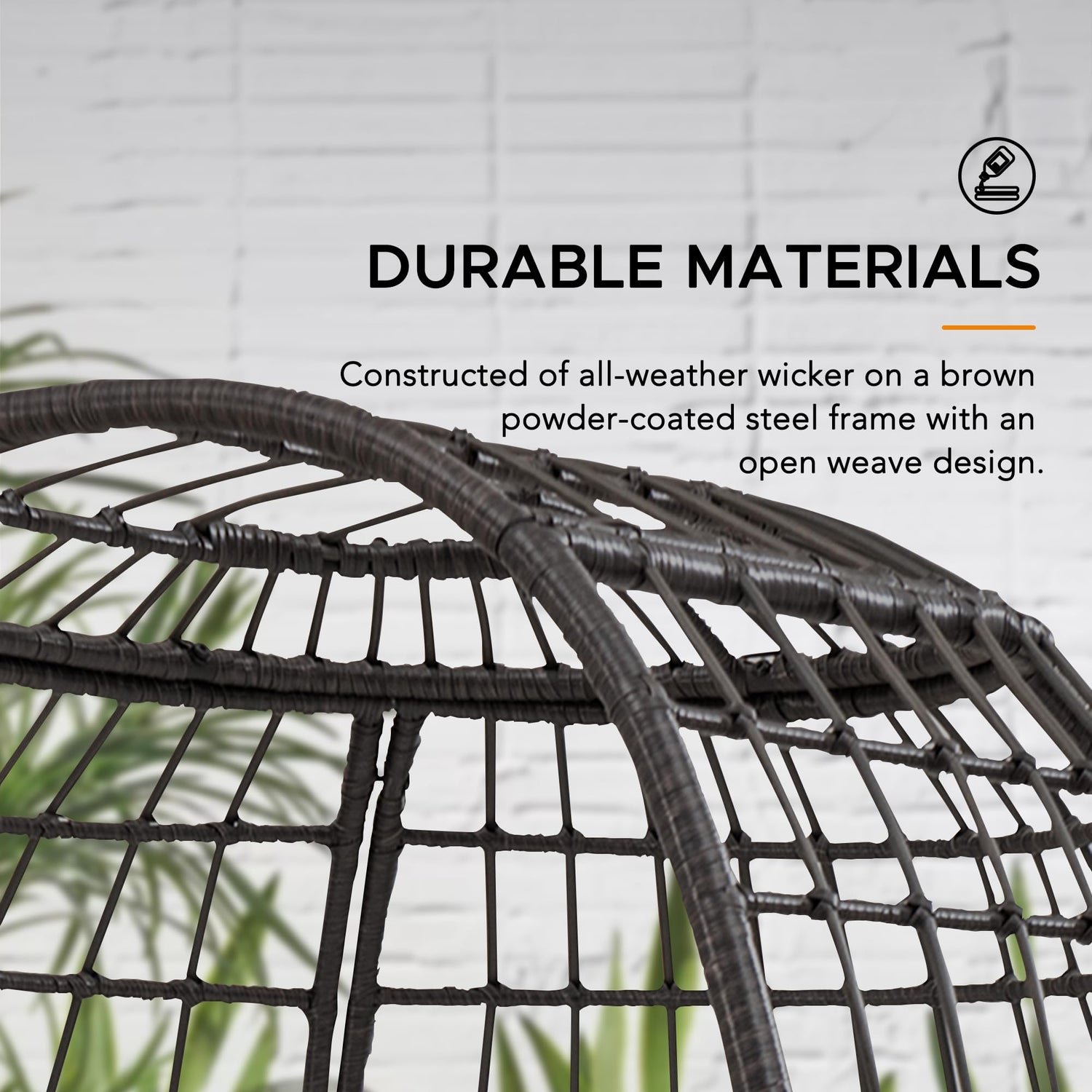 - Durable Materials: Constructed of all-weather wicker on a brown powder-coated steel frame with an open weave design, this and outdoors. egg chair is incredibly durable. Our cushions are made of white weather-resistant fabric, which is ideal for indoors