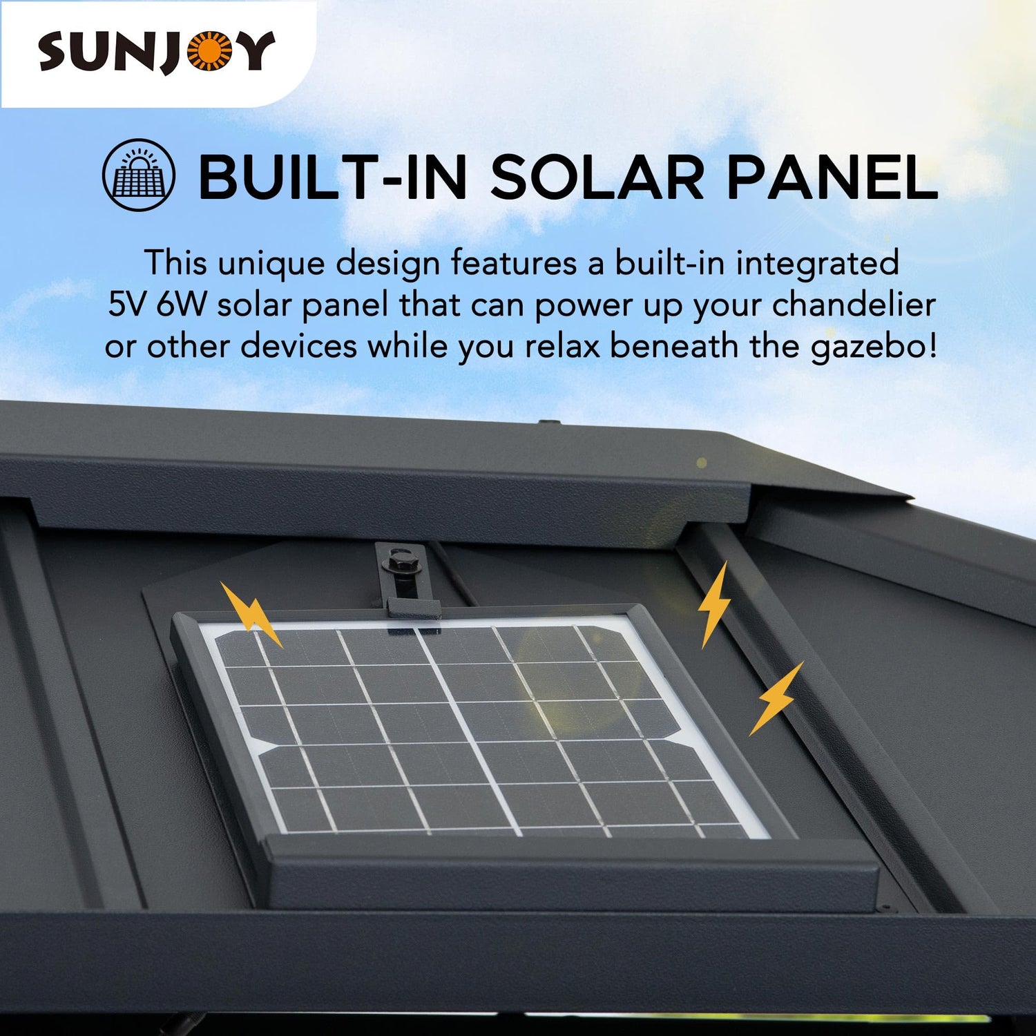 Sunjoy Hardtop Gazebo 10 x 12 ft. Outdoor Patio Aluminum Frame Gazebo with Solar Panel, 2-Tier Steel Hardtop Backyard Gazebo with Netting and Ceiling Hook, Black