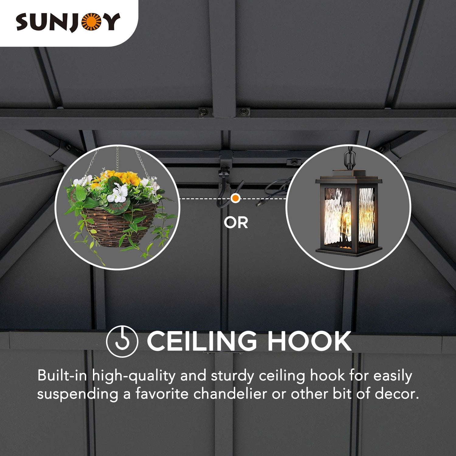 -Keep cool in the shade under the rust-resistant powder-coated aluminum frame and steel roof hardtop gazebo. Set the mood by suspending a chandelier from the incorporated ceiling hook for functional light and high design.