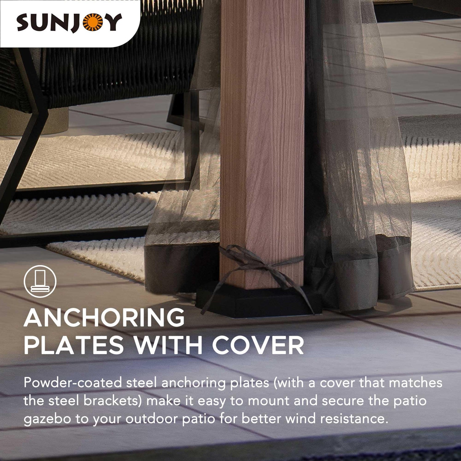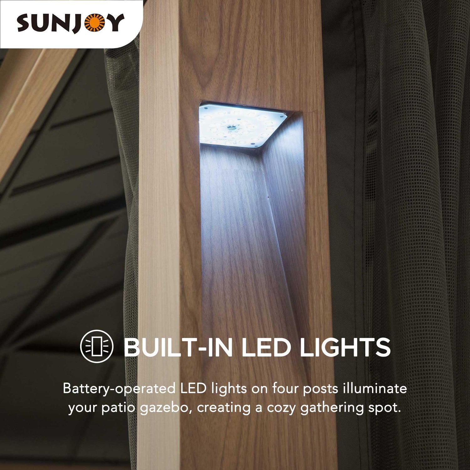 Sunjoy Hardtop Gazebo 10 x 12 ft. Outdoor Patio Gazebo with LED Lights (Batteries Operated), Remote Control and Netting, Black