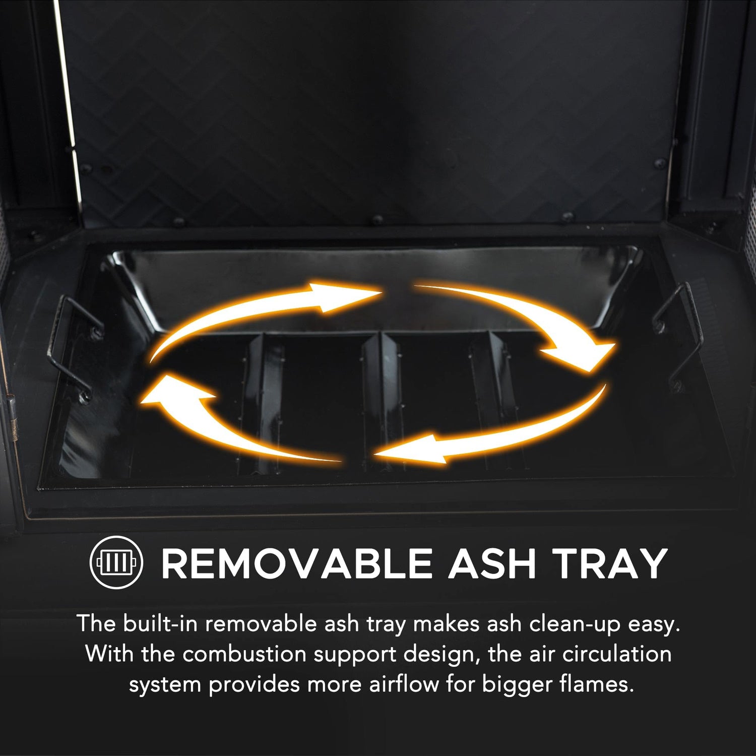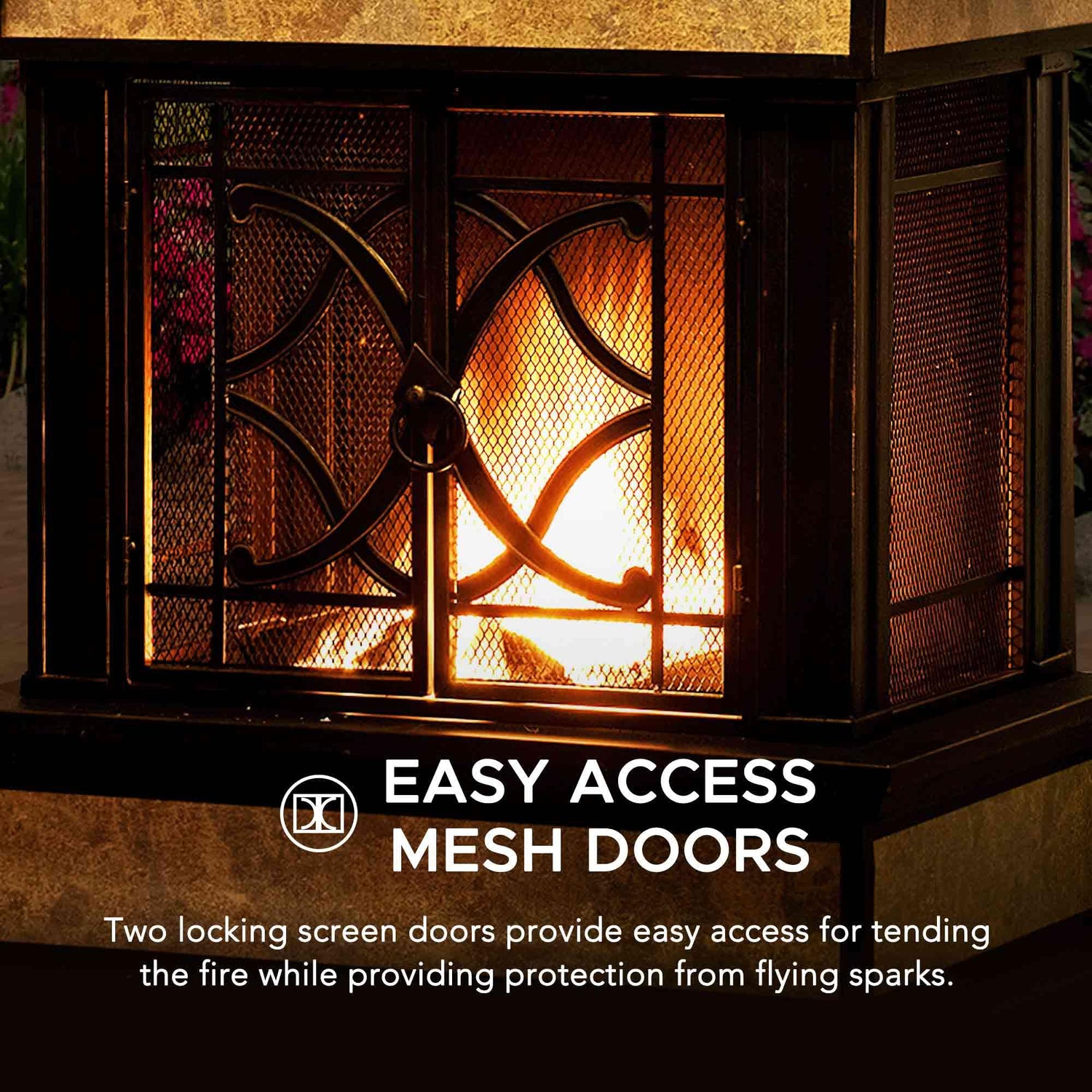 - 【Functional Doors & Chimney】- The large chimney effectively directs smoke and ash up and away providing superior exhaust control. Two mesh screen doors with a locking latch allow easy access to the fire and enhance safety by catching flying embers.