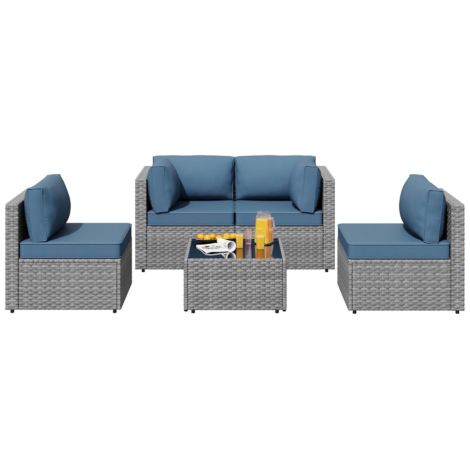 - [Easy to assemble] All parts is easy to assemble with clear instructions and all necessary accessories included. What you get: 5-piece patio conversation set contains: 2*Conner Sofas: 29.5 x 29.5 x 24.8 inches, 2*Armless Sofas: 29.5 x 25.6 x 24.8 inches, 1*Coffee Table: 25.6 x 25.6 x 13 inches.