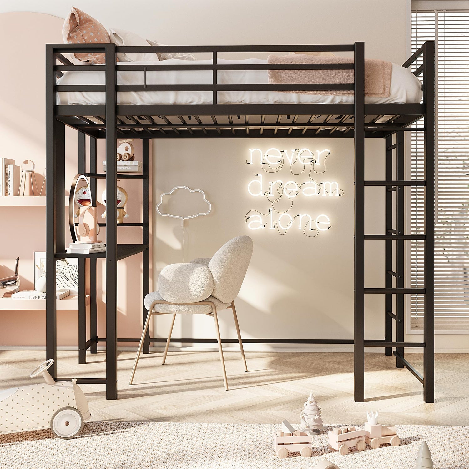 SUNLEI Loft Bed Full Size with Desk and Safety Guard Rail, Full Size Metal Bed Frame with Double Layer Shelves for Storage, No Box Spring Needed and 2 Security Ladders, Black