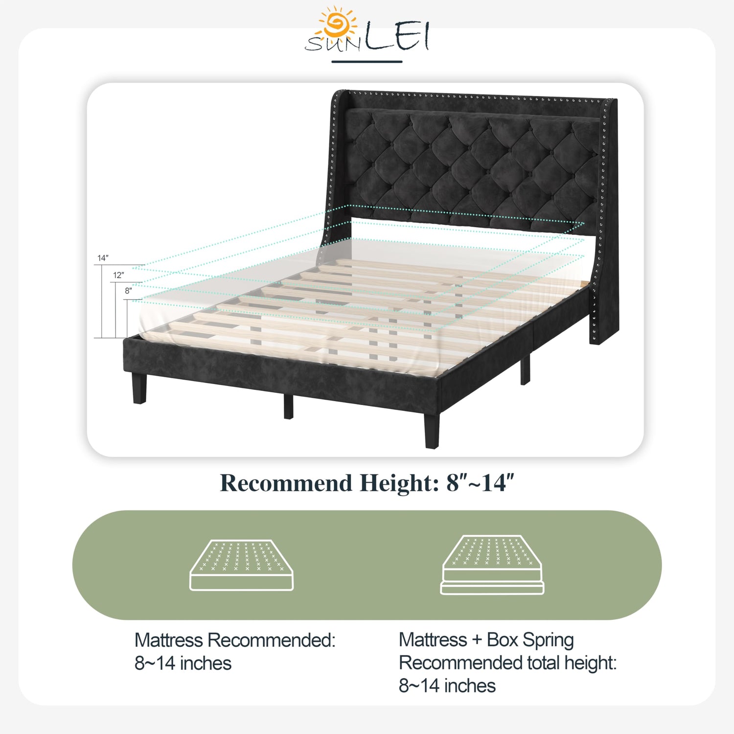 SUNLEI Queen Size Bed Frame with Diamond Tufted Headboard and Storage, Upholstered Platform Bed Frame Queen with 2 Large Wingbacks, Sturdy Wooden Slats Support, Easy Assembly, Velvet Black