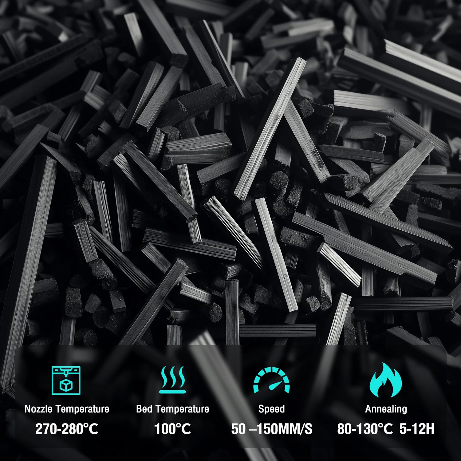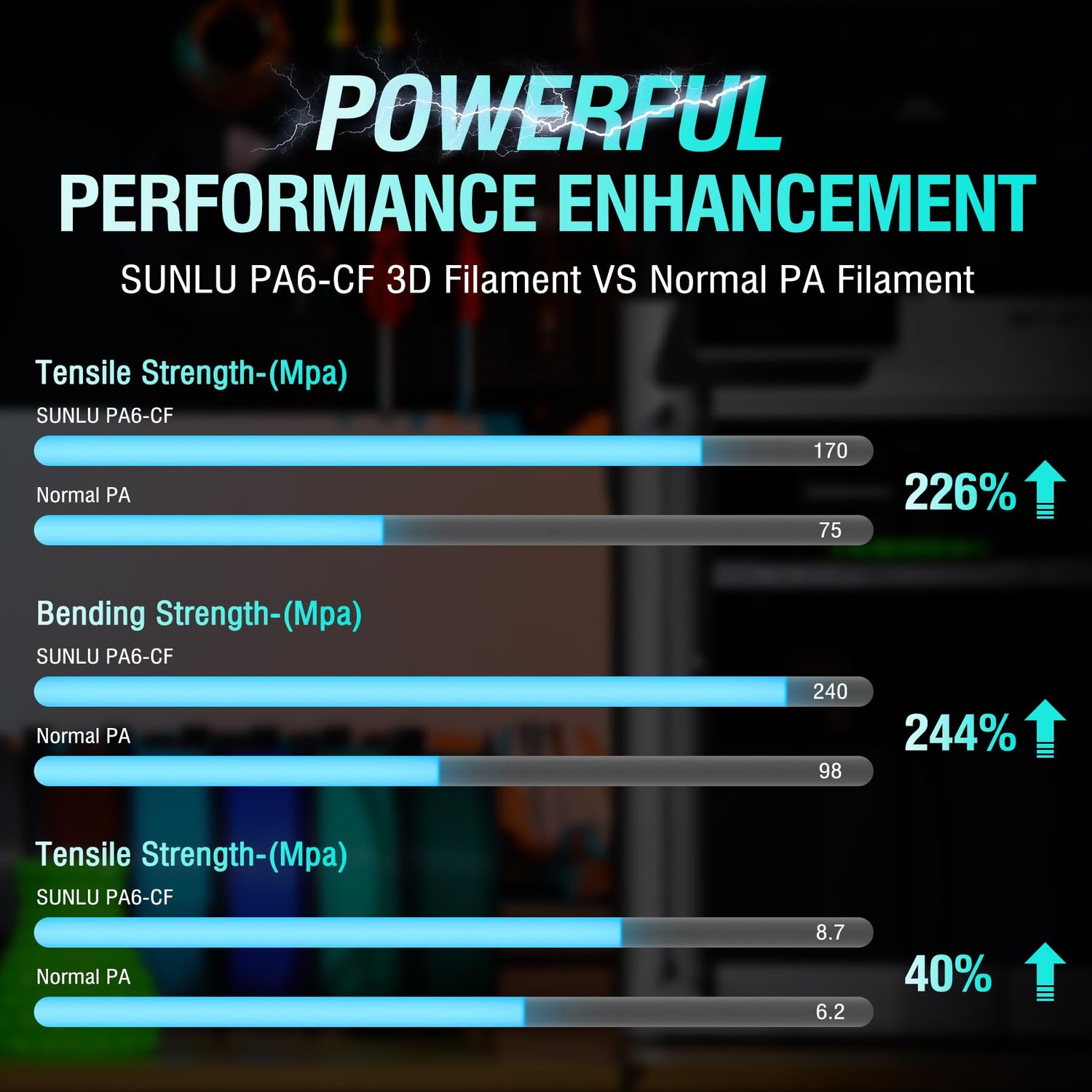 - 【Stiff & Strong & Heat Resistant】 - SUNLU PA6-CF nylon filament 1.75mm is made of 80% PA and 20% Carbon Fibers. The carbon fiber reinforcement really provides significantly improved stiffness, strength and heat resistance with outstanding layer adhesion.