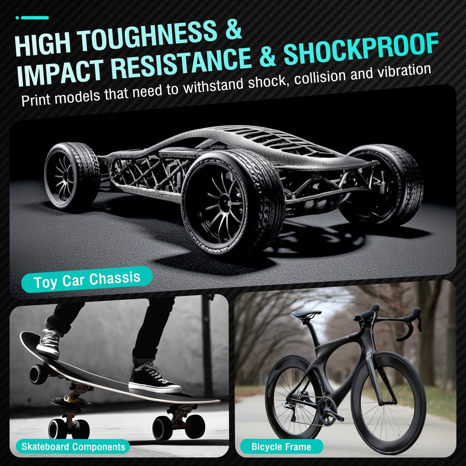 - 【Good for Industrial Engineering Printing】 - SUNLU PA6-CF is very strong, durable and features an excellent heat resistance, the models printed with Carbon Fiber Nylon Filament can be used in many industrial fields. It can be used in applications requiring torsional, tensile, and impact strength. Such as gears, screws, helmets, fan blades, toy car chassis, skateboard parts, bicycle frames, etc.