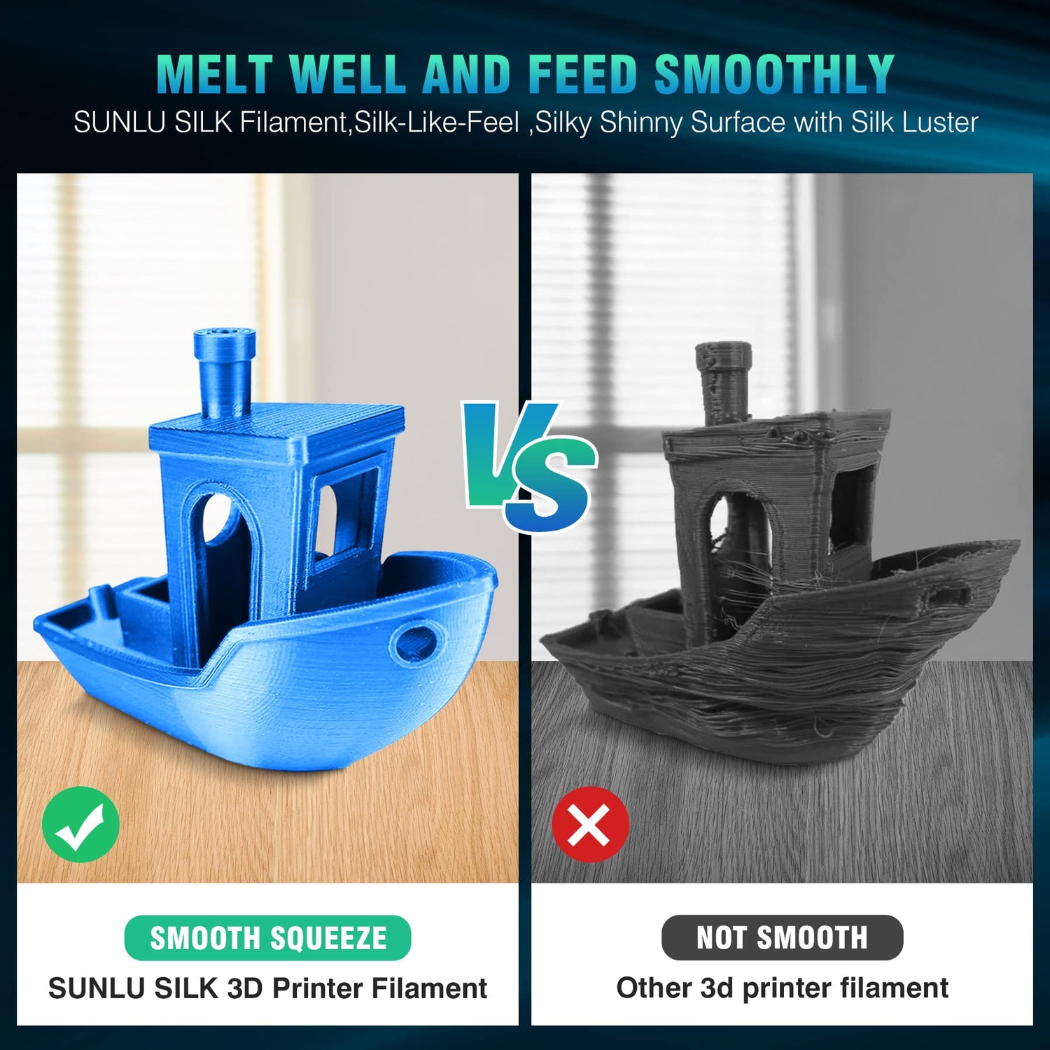 - ②【SUNLU Shiny SILK PLA Filament 1.75mm】Compared to regular PLA 3D printer filament, SUNLU SILK PLA 3d printer filament has a glossy, smooth silk surface that does not require polishing. SUNLU fantastic SILK filament has great colour and shine,making it ideal for printing art and craft.Great SILK PLA filament for any 3D print job.It has a nice silk looking shine on prints.