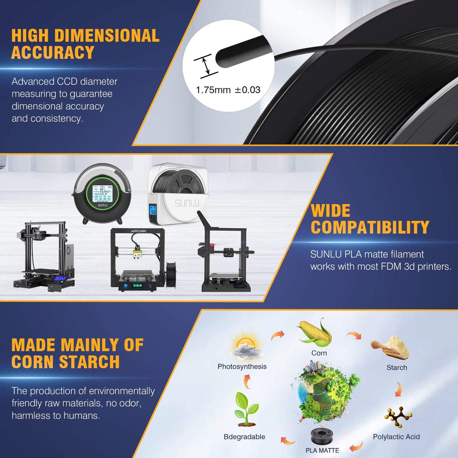 - 【PLA Features & Matte Color】- SUNLU's newly upgraded Matte PLA Filament colors retain the original SUNLU PLA advantages: Easy Printing, No Clogging, while adding more color options. Matte PLA can print prints with non-glossy colors and frosted textures, suitable for more premium and mysterious 3D models.