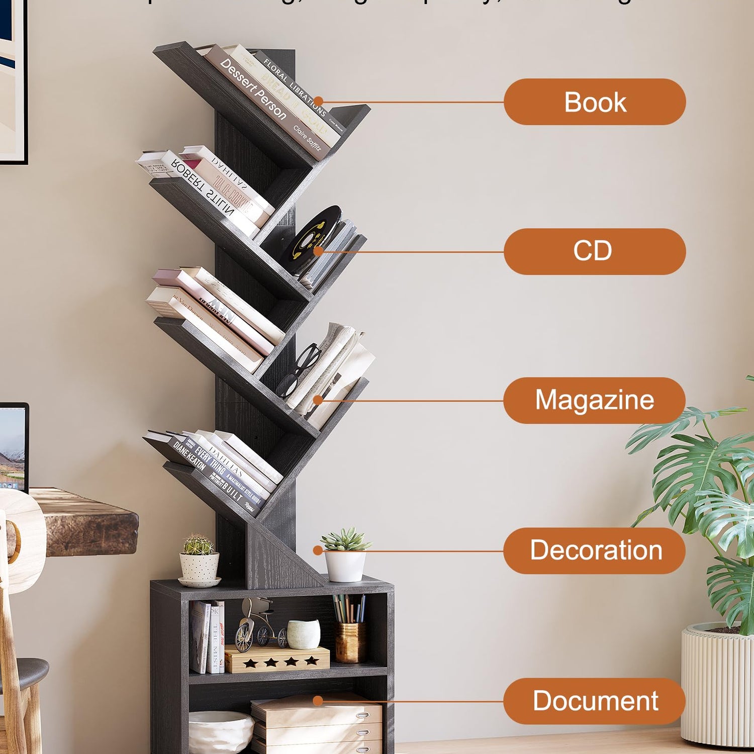 Featuring a compact design, this floor-standing tree bookshelf serves as the ideal solution for bedrooms, home offices, corners, hallways, or smaller living rooms. Its narrow construction allows it to fit seamlessly into tight spaces while providing ample storage for books, CDs, game cassettes, decorations, and more. You'll enjoy a neat and clutter-free environment, effortlessly showcasing your personal collection.