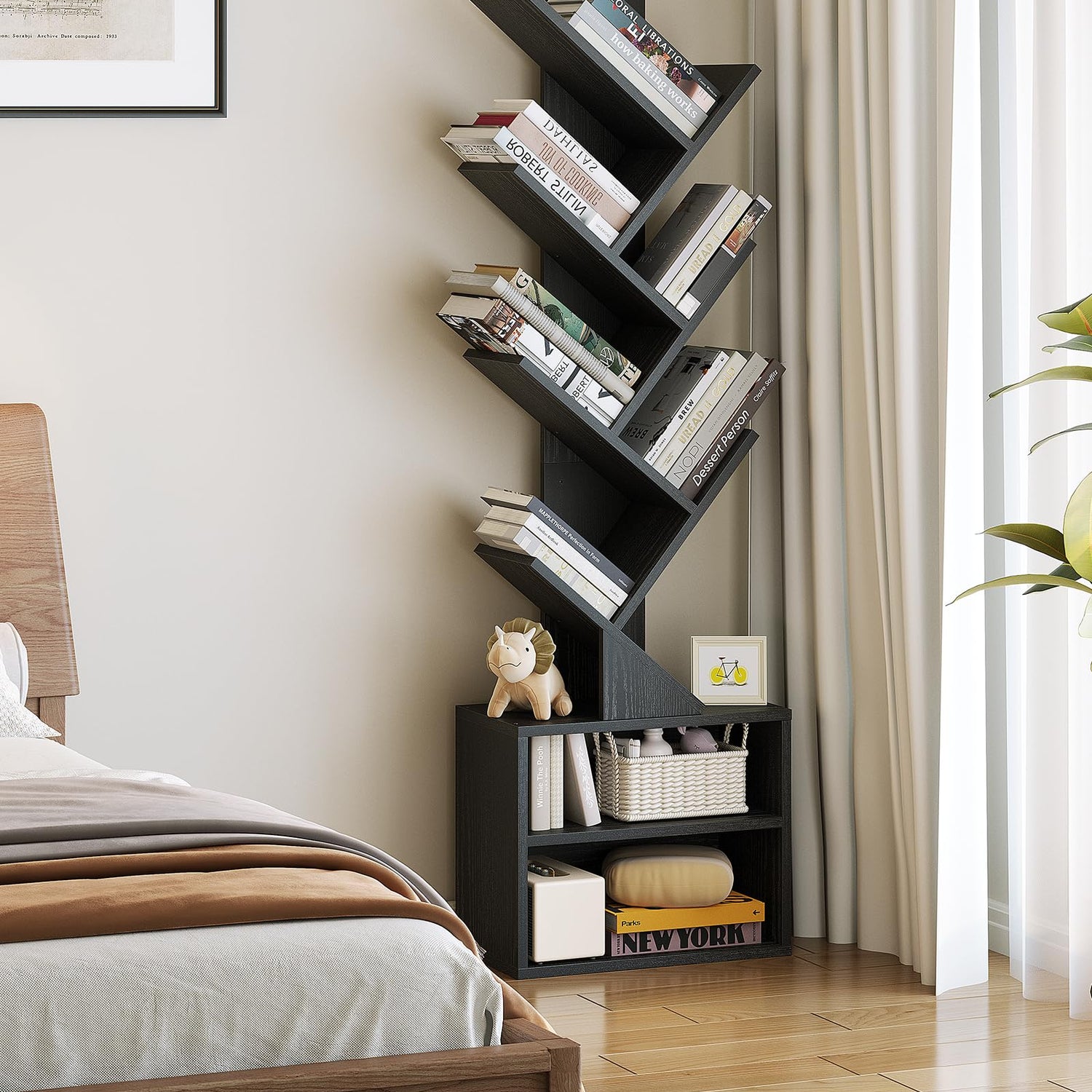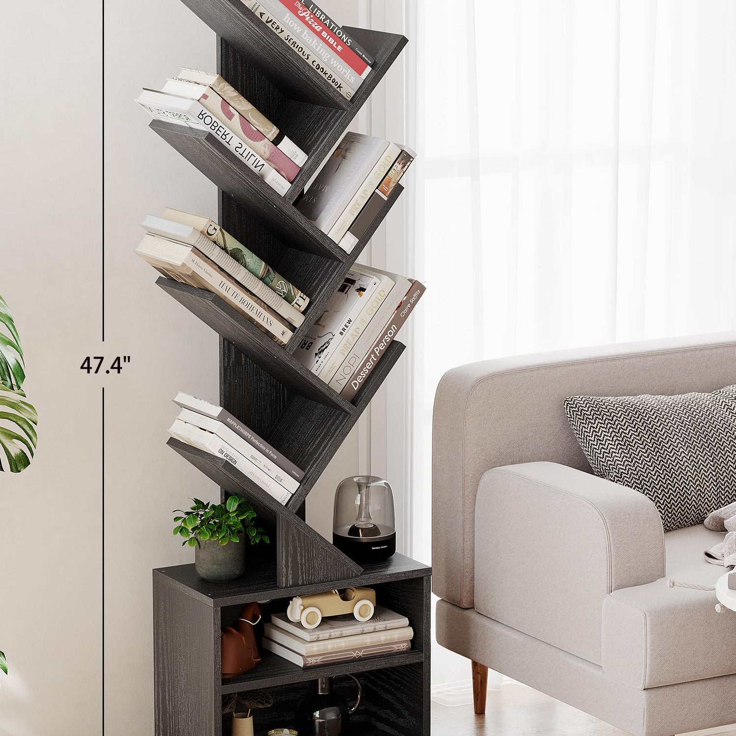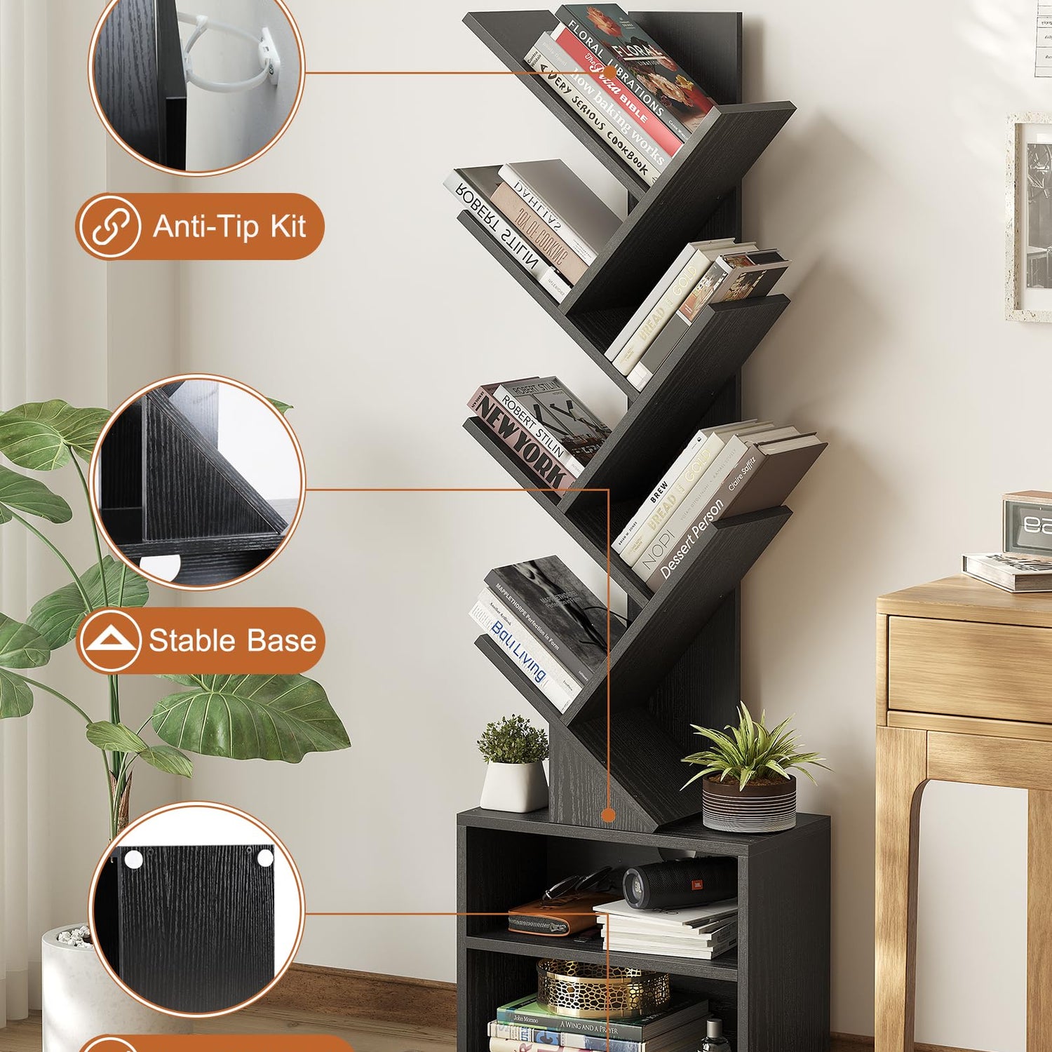 The SUNMORY bookshelf’s unique tree structure not only adds to its aesthetic appeal but also reinforces its stability. Its sturdy base and reliable backboard mean you can proudly display your treasures without worry. Plus, for added safety, the included anti-tip accessories allow you to secure the piece to the wall, making it an excellent choice for households with small children or pets.