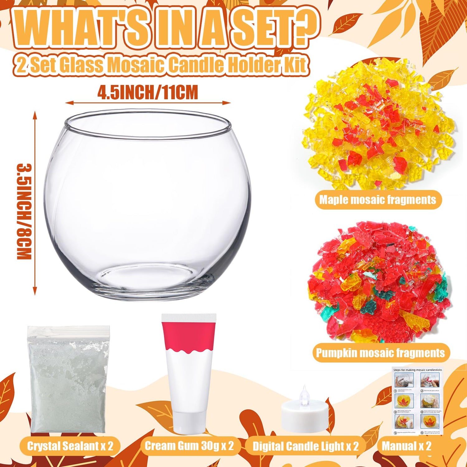 - Complete Package: the glass mosaic kit comes with 2 sets providing double the creativity opportunities, fall candle holder includes glass jar, candle, mosaics, cream glue, cleaning sponge, crystal caulk and Instruction manual; These mosaic art kit give you all the tools needed to create elegant, unique candle holders; It's a comprehensive package for anyone with a creative inclination