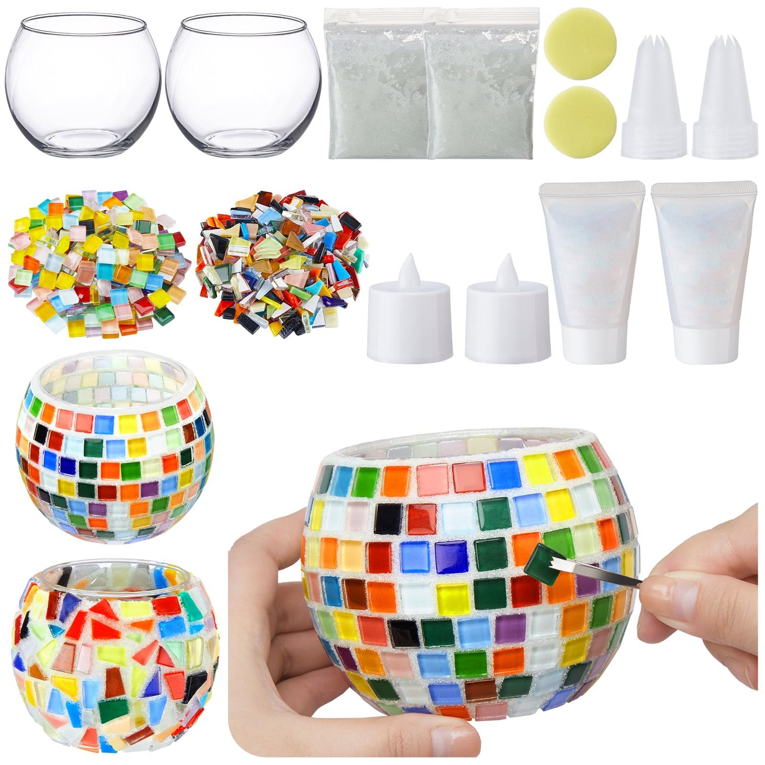 - A Complete Package: the glass mosaic kit comes with 2 sets providing double the creativity opportunities, each set includes glass jar, candle, mosaics, cream glue, cleaning sponge, crystal caulk and Instruction manual; These kits give you all the tools needed to create elegant, unique candle holders; It's a comprehensive package for anyone with a creative inclination