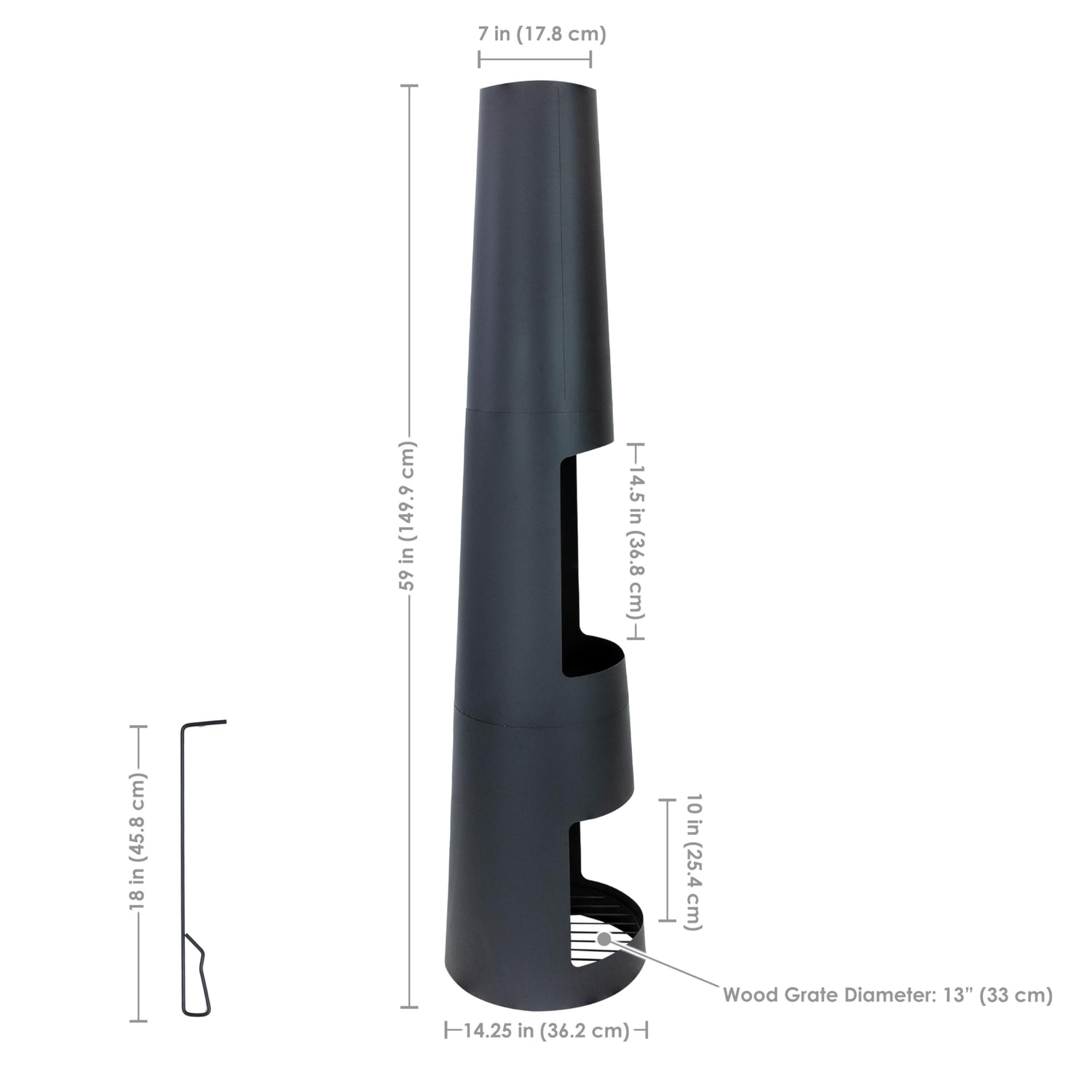 - SPACE-SAVING DESIGN: This fire pit chiminea measures 14.25" in diameter x 59" H and weighs 18.4 lbs. The top measures 7" in diameter. The log storage area is 17" H. The fire area opening measures 10.5" W at the bottom (9" W at the top) x 14.5" H. The fire pit bowl is 11.5" in diameter. The bowl has an inner diameter of 8.5" and an inner height of 3". The log storage area opening measures 12.75" W at the bottom (12" W at the top) x 10" H. It includes a removable 13" diameter wood grate.
