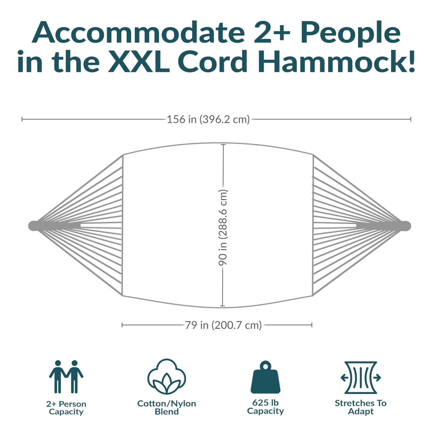 - EXTRA LARGE SIZE: This patio hammock measures 156" W x 90" D. The 2-person hammock bed measures 79" W x 90" D. It has a weight capacity of 625 pounds.