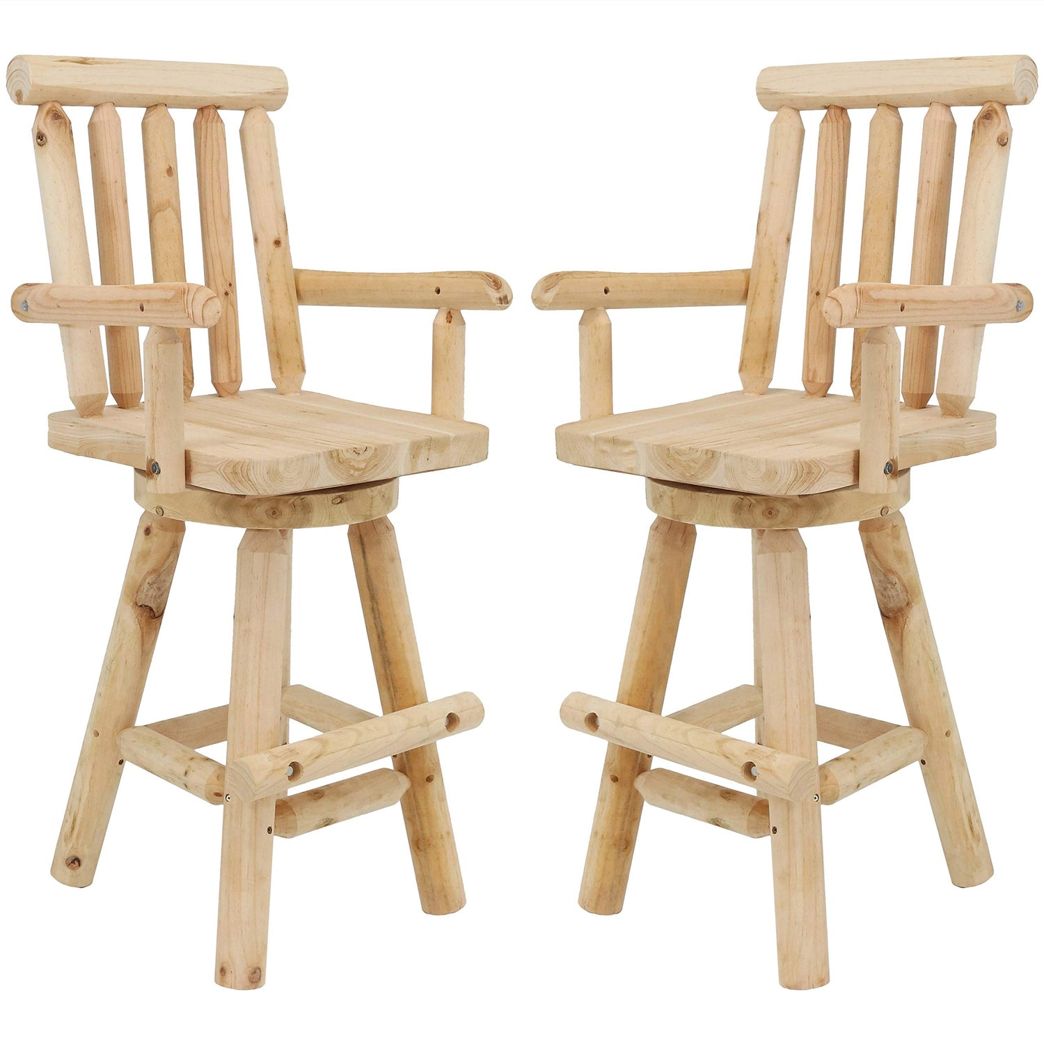 Details: This rustic-style, wooden barstool will add natural charm to the kitchen, rec room, patio, or bar. Its tall design ensures that this chair can be used with home bars, pub tables, kitchen islands, and counters. It features a sturdy back and armrests for comfort and support. This bar chair also features a convenient memory return swivel plate that provides a 180-degree range of motion. Made of dependable fir wood, this stylish chair will bring a bit of the Northwoods to any home or cabin. This chair may feature "checking” (splits in the wood) for added design. Checking is a natural phenomenon that is common in wood furniture construction and will not affect the overall stability of the chair. Plus, this elegant chair can be stained any color to complement a variety of decor colors and styles. This bar chair is designed for indoor or outdoor use.