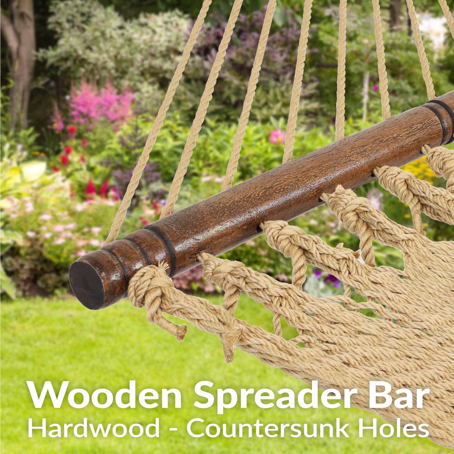 - COMFORT AND STYLE: This heavy-duty outdoor hammock is made from tightly woven, soft-spun polyester rope, which is superior and longer lasting than cotton. The wood spreader bars allow for extra stability and style.