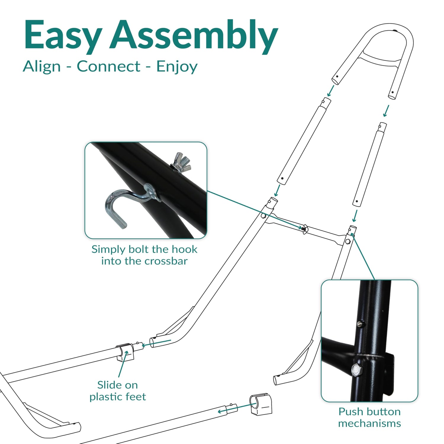 - EFFORTLESS ASSEMBLY: This outdoor hammock stand includes two 3" S-hooks, two heavy-gauge hanging hooks, four plastic feet, and two 18" chains to make it easily adjustable to any desired length. Assembly is easy and requires no special tools. All joints lock together with easy spring-snap button mechanisms.