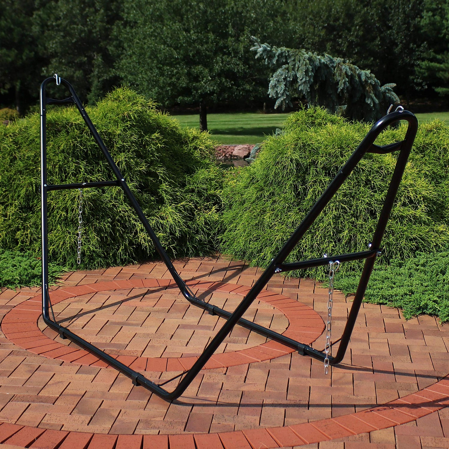 - ACCOMMODATES A VARIETY OF HAMMOCKS: The adjustable hammock stand measures 124" W x 40" D x 52.5" H. The base bars are 55" L. With the included chains and hardware, this stand will fit small to large hammocks, including Mayan, Brazilian, camping, or spreader bar style, ranging from 9.5' to 14' long. The hammock stand can support up to 550 lbs and weighs approximately 33 lbs.