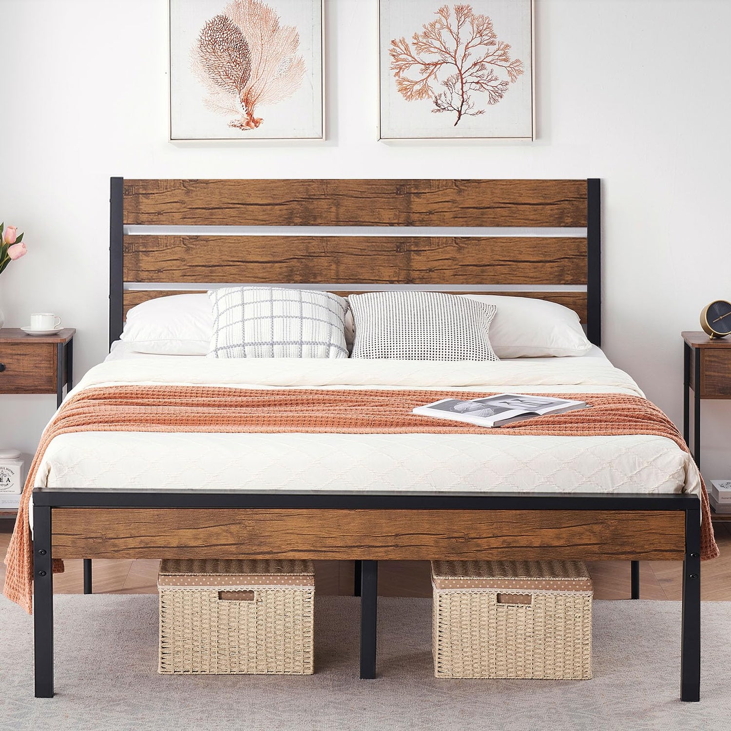 SunnyFurn Rustic Full Bed Frame with Headboard,Metal Platform Farmhouse Bed Frame Wood Slat,Sturdy Heavy Duty Bed Frame,No Box Spring Needed,Easy Assembly,Under Bed Storage, Rustic Brown, Full Size