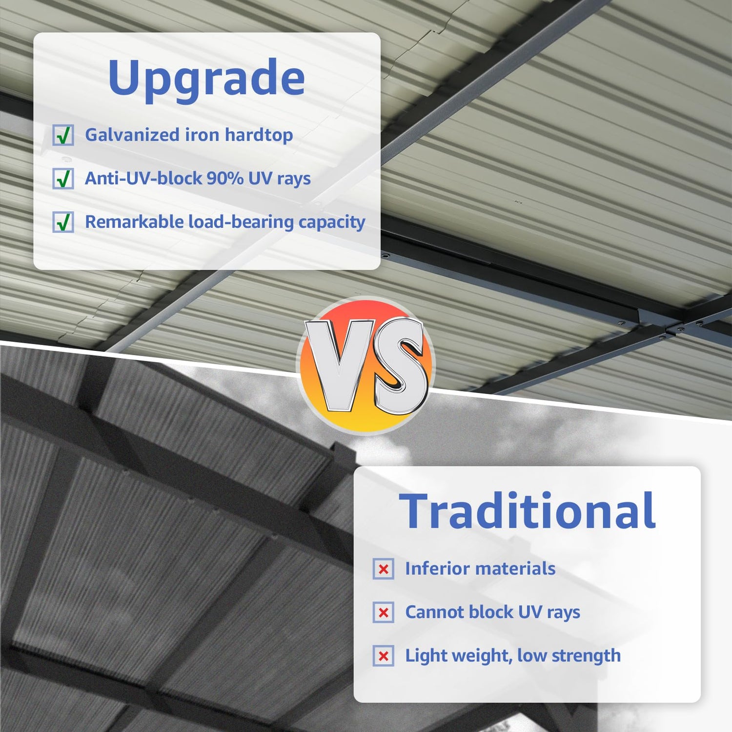 - HEAVY DUTY GAZEBO: This outdoor gazebo serves as an extension of your home, blending seamlessly with your outdoor space. Crafted with galvanized iron panels, the metal gazebo allows sunlight to filter through and reduce the heat, anti-UV-block 90% UV rays, which is more sturdy, high temperature resistant, heavy wind resistant.