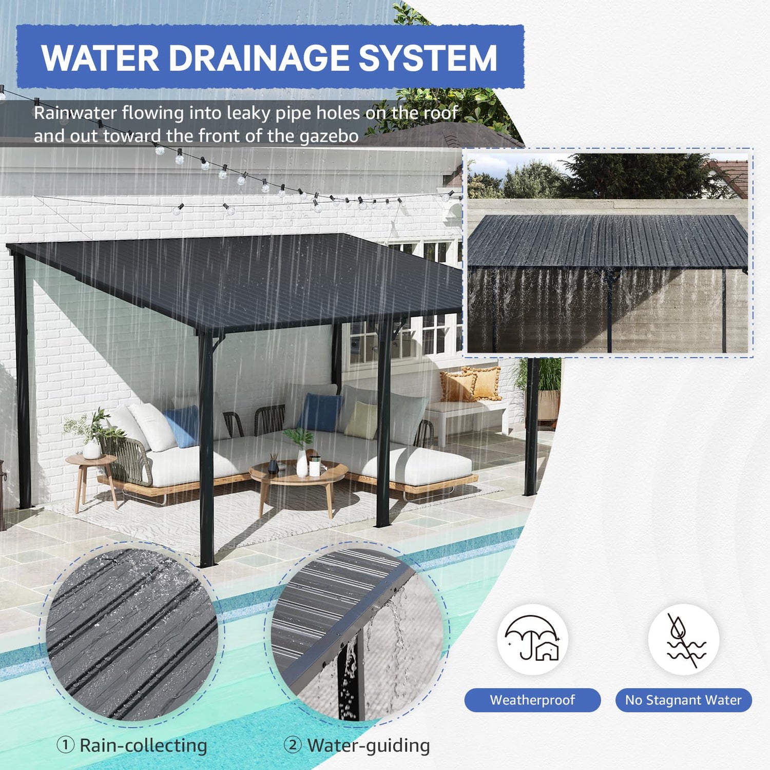 - SLOPED ROOF & DRAINAGE HOLES: The unique sloped roof design efficiently drains rain and snow, preventing pooling or standing water damage. While, drainage holes can reduce the pressure of rain and snow accumulation on the roof of lean to gazebo by facilitating water runoff to extend the life of the deck gazebo. Enjoy the outdoors without weather-related concerns.