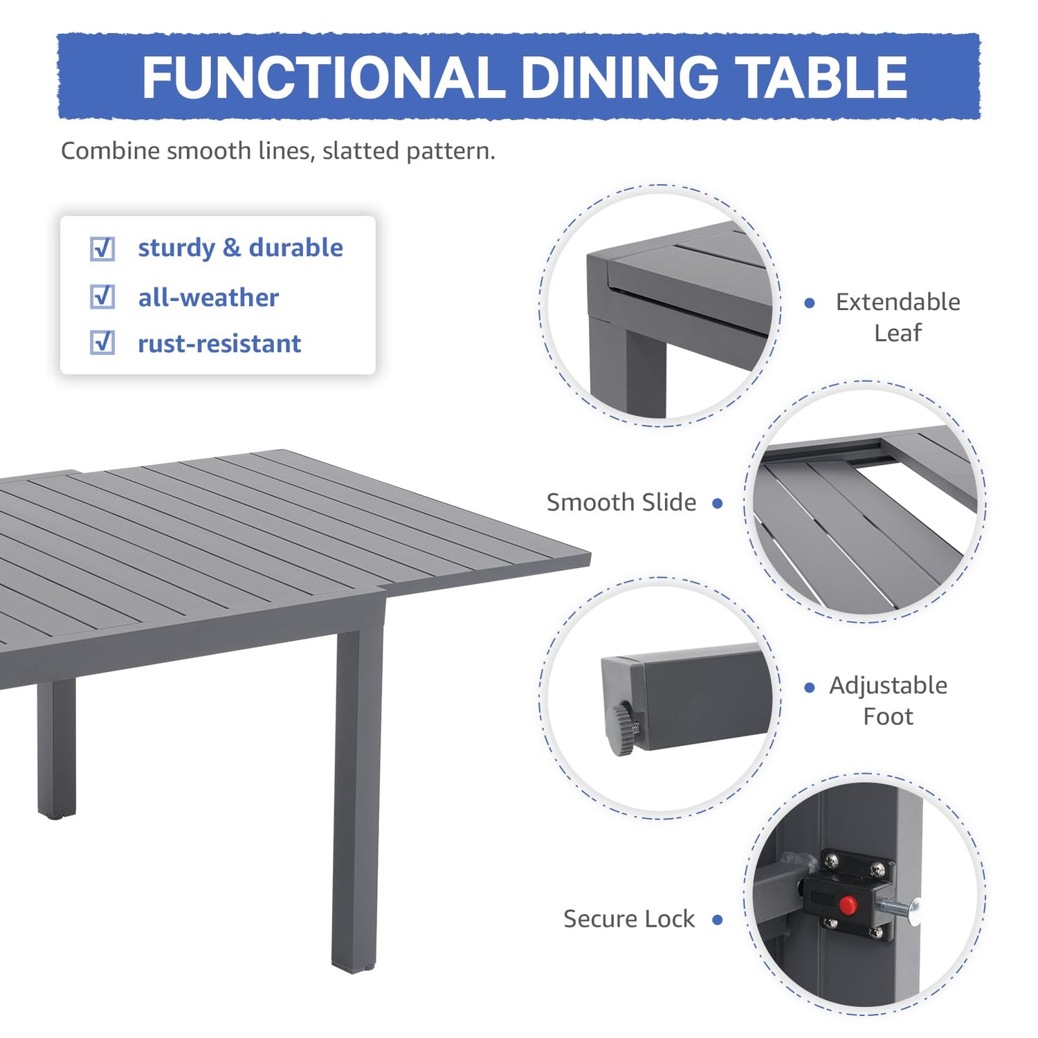 - 【DURABLE FRAME & FUNCTIONAL DETAIL】: Durably made of solid aluminum with a rust- and weather-resistant finish, helping ensure a sturdy dining table set that lasts for years to come. Also, there are adjustable leveling feet to stay balanced and protect the rectangular table during movement.