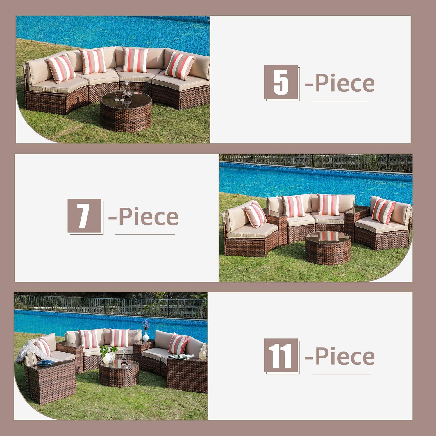 - COMFORT UPGRADES - Multiple arrangement possibilities, whether arranged together or used separately. The patio sectional furniture set will add a touch of elegance and style to your patio, garden, backyard, porch, sunroom or pool.
