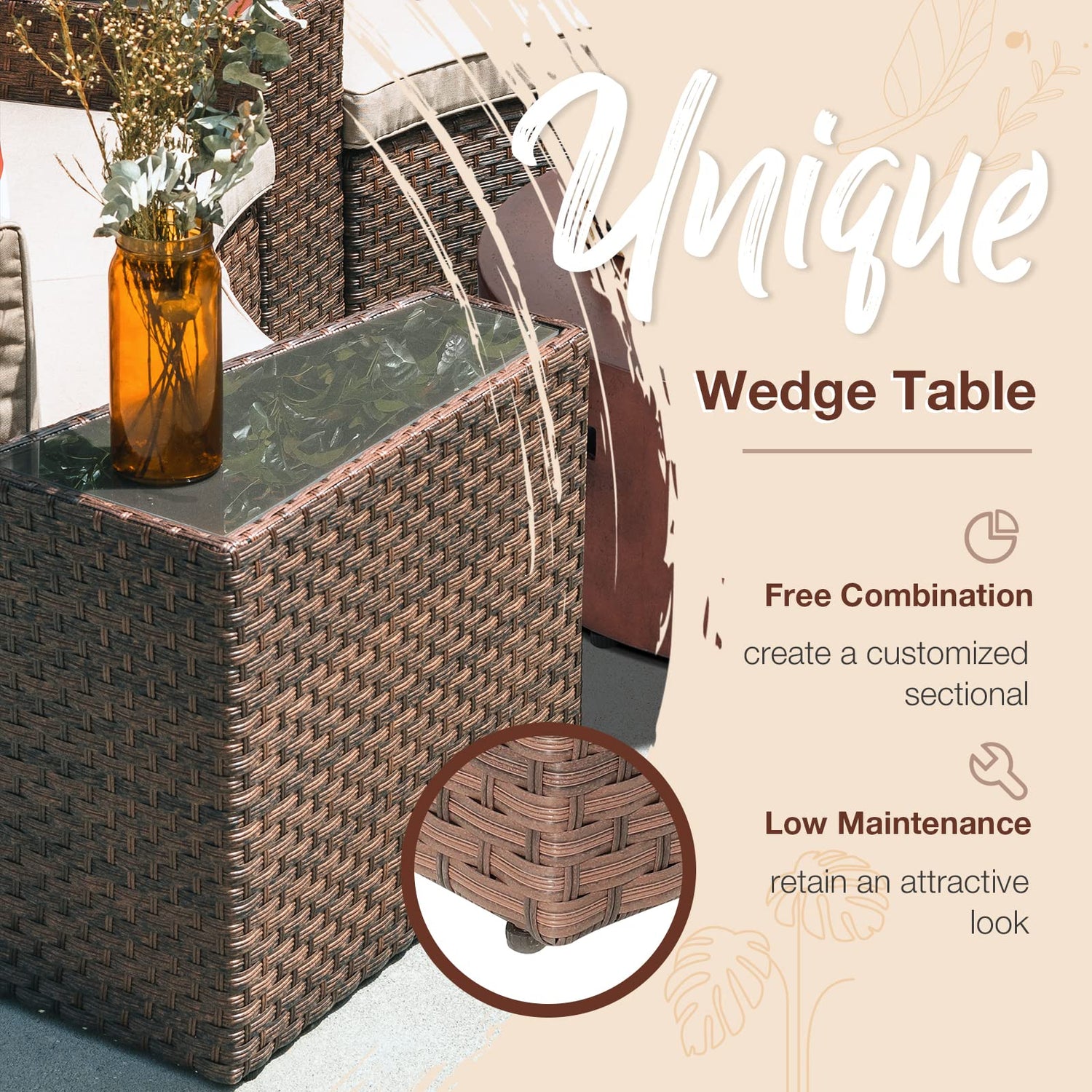 - Two (2) Side Tables - The sophisticated wicker design side table is hand woven by resin wicker and powder coated steel framed for seasonal outdoor use. It is a great addition to the outdoor patio furniture set to keep books, drinks, foods and small plates within reach. The tempered glass table top requires low maintenance.