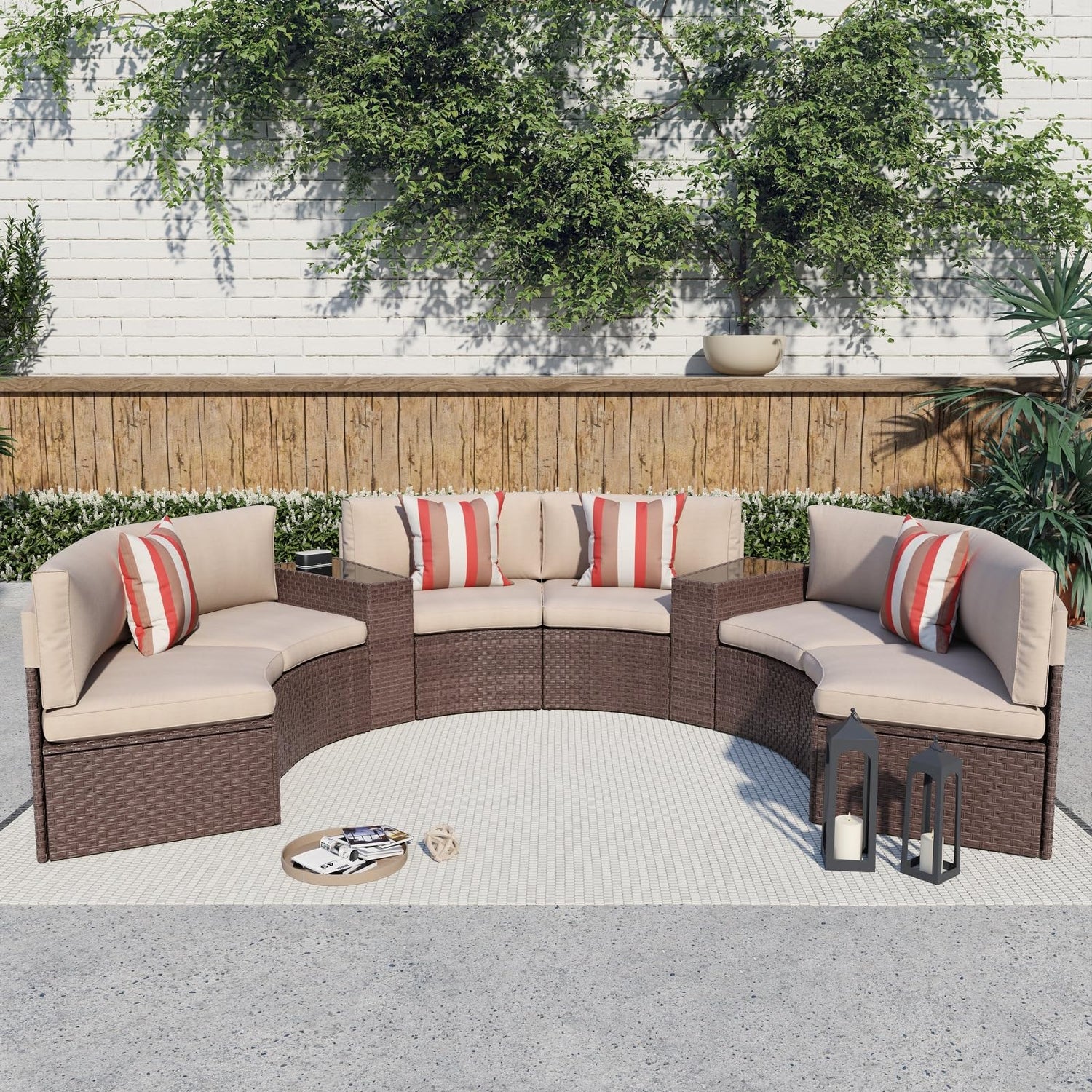 SUNSITT Outdoor Patio 8-Piece Half Moon Curved Furniture Sofa Set Brown Wicker Sectional Sofa Beige Cushions with 2 Side Table