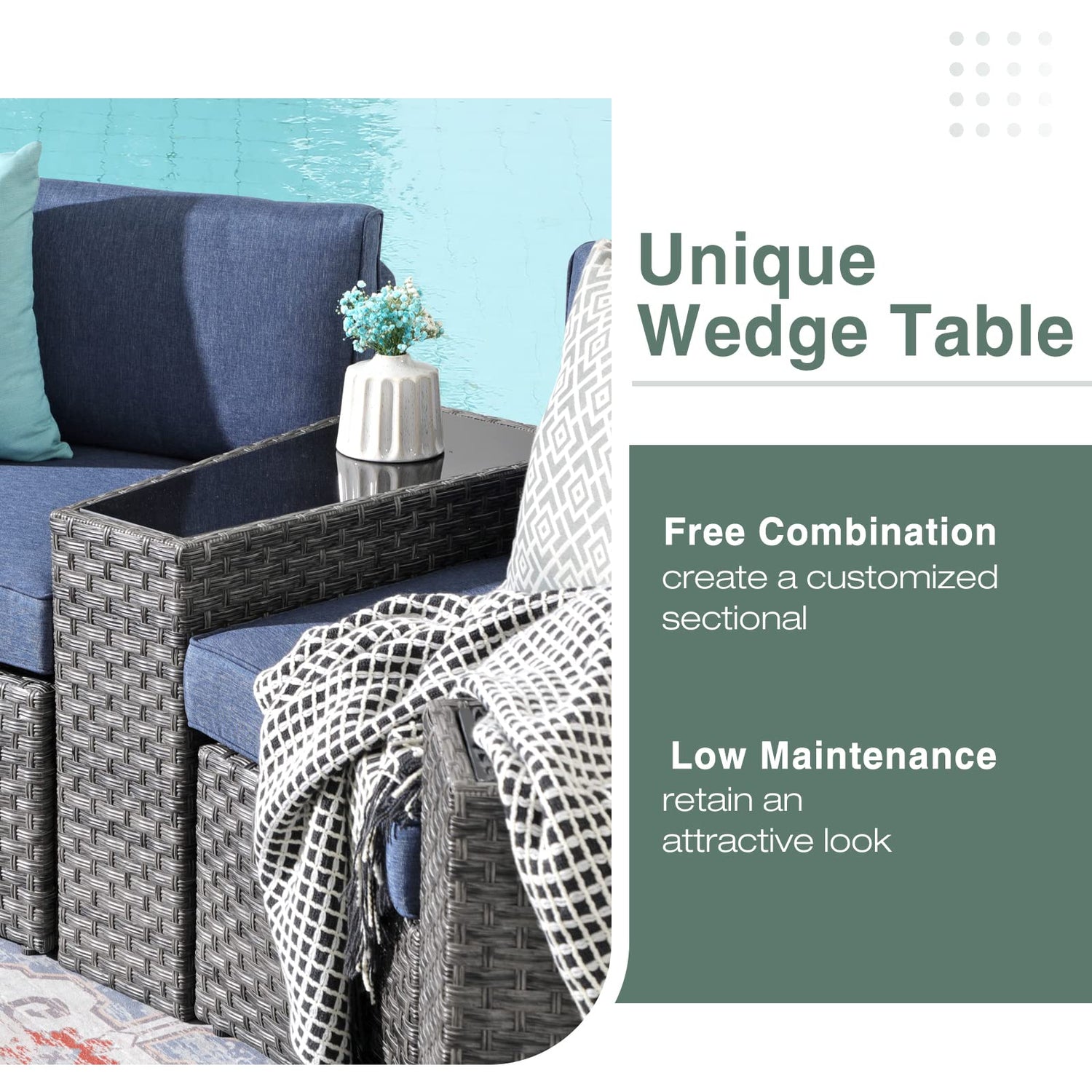 - STYLISH DESIGN – Rich grey resin wicker in complex pattern paired with denim blue cushions for a refined, textured look, halfmoon patio furniture is the perfect addition to outdoors. Pure green & grey lattice fancy decorative pillows combined to really make the sectional sofa set stand out.