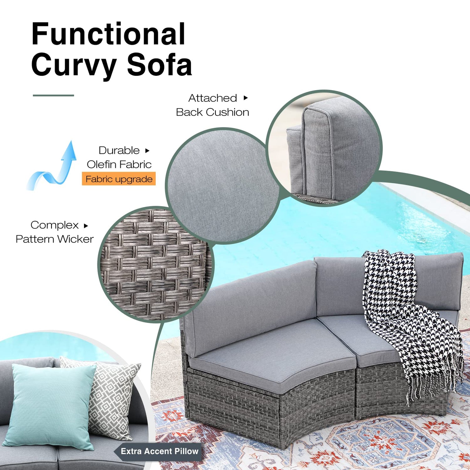 - STYLISH DESIGN – Rich grey resin wicker in complex pattern paired with grey cushions for a refined, textured look, halfmoon patio furniture is the perfect addition to outdoors. Pure green & grey lattice fancy decorative pillows combined to really make the sectional sofa set stand out.