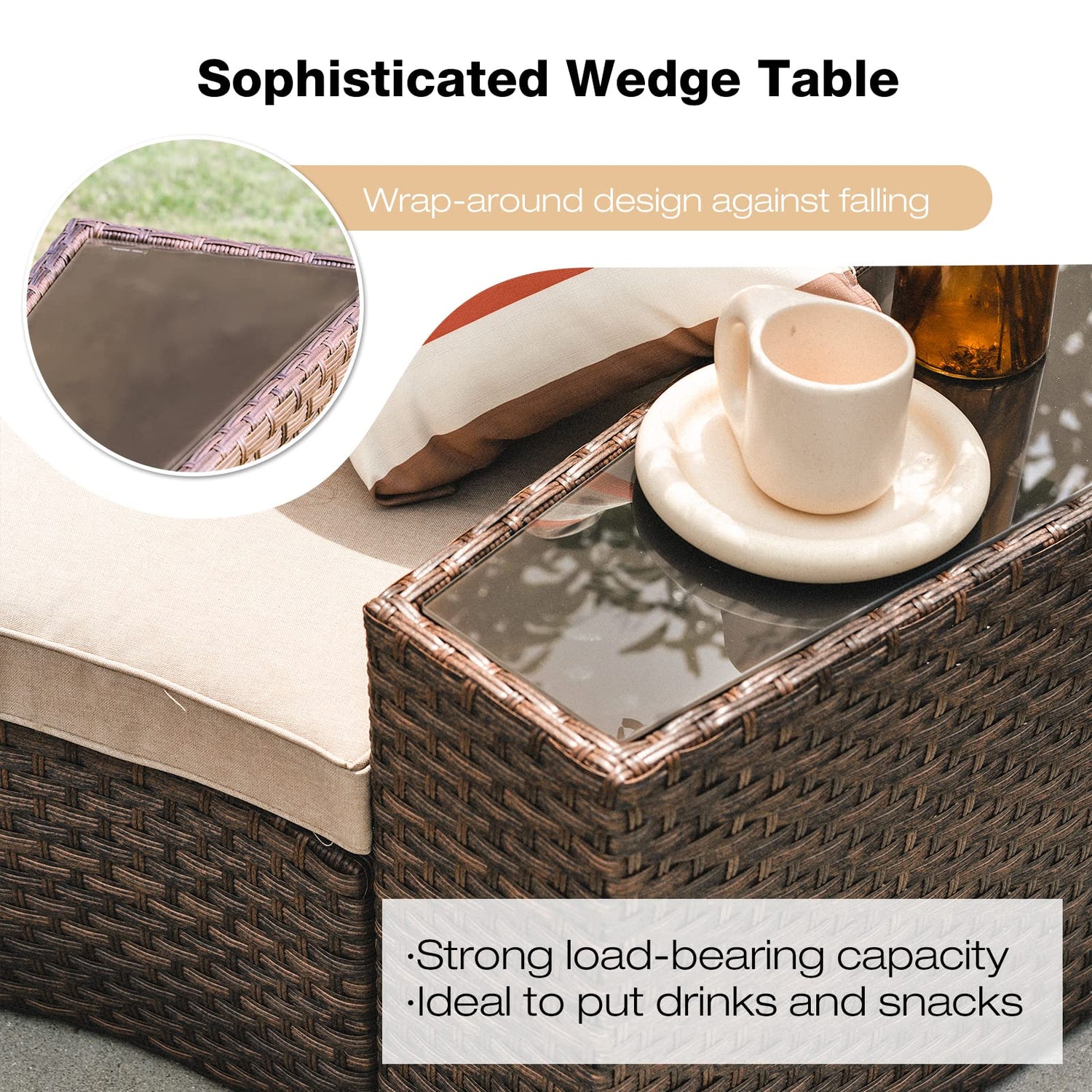- TWO SIDE TABLE - The specially wedge-shaped side table can perfectly match the half-moon sofa set. With a tempered glass tabletop, the 2 wedge tables provide a place to securely support drinks and serving dishes for your garden, porch.