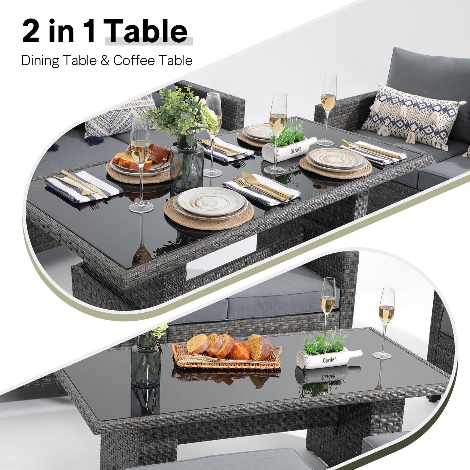 - MULTI COMBINATION – Complement with elegant wicker lifting table, sectional sofas can be freely placed to fit your outdoor use and ottomans can serve as accent seating or coffee table. The outdoor dining set is designed to maximize space and accommodate up to 7 people for comfortable gatherings.