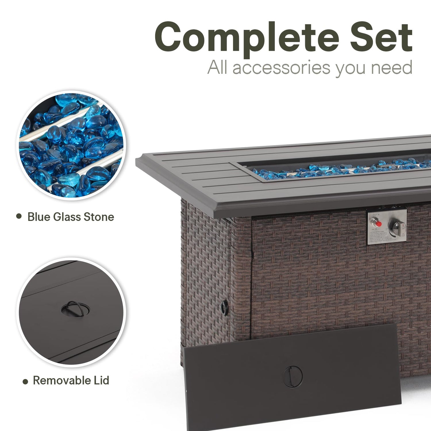 - CLEAN & STABLE FIRE - This modern design outdoor propane fire pit is complete with blue glass beads, that provide an inviting glow and help radiate the warmth more evenly when sitting around outdoor furniture set.(Note: The wind guard isn't included)