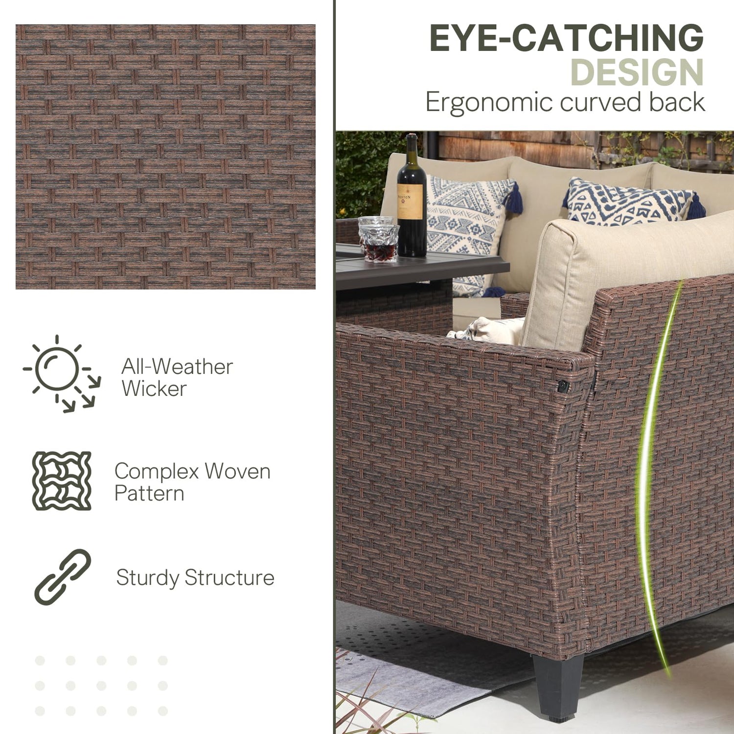 - STYLISH DESIGN - Designed for long-lasting quality, patio furniture set features a rich brown hue all-weather wicker and durable olefin fabric. Curved wider chair back with higher foot leveler is distinctive and ornamental while the matching propane fire pit table offers extra attractive look.
