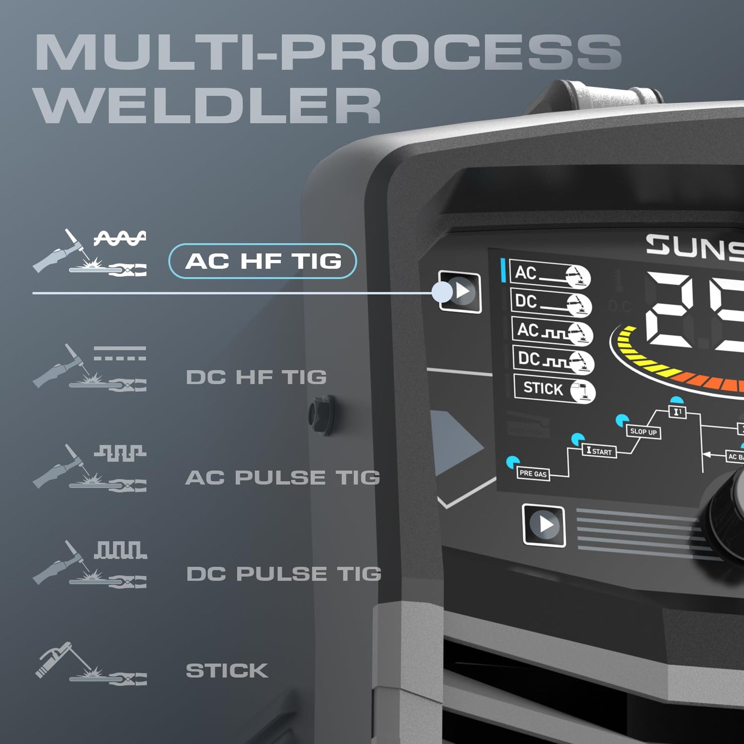 Sunstac 250A AC/DC Aluminum TIG Welder with Pulse, 110V/220V Dual Voltage TIG Welding Machine with DC TIG/AC TIG/Pulse TIG/SPOT TIG/Stick