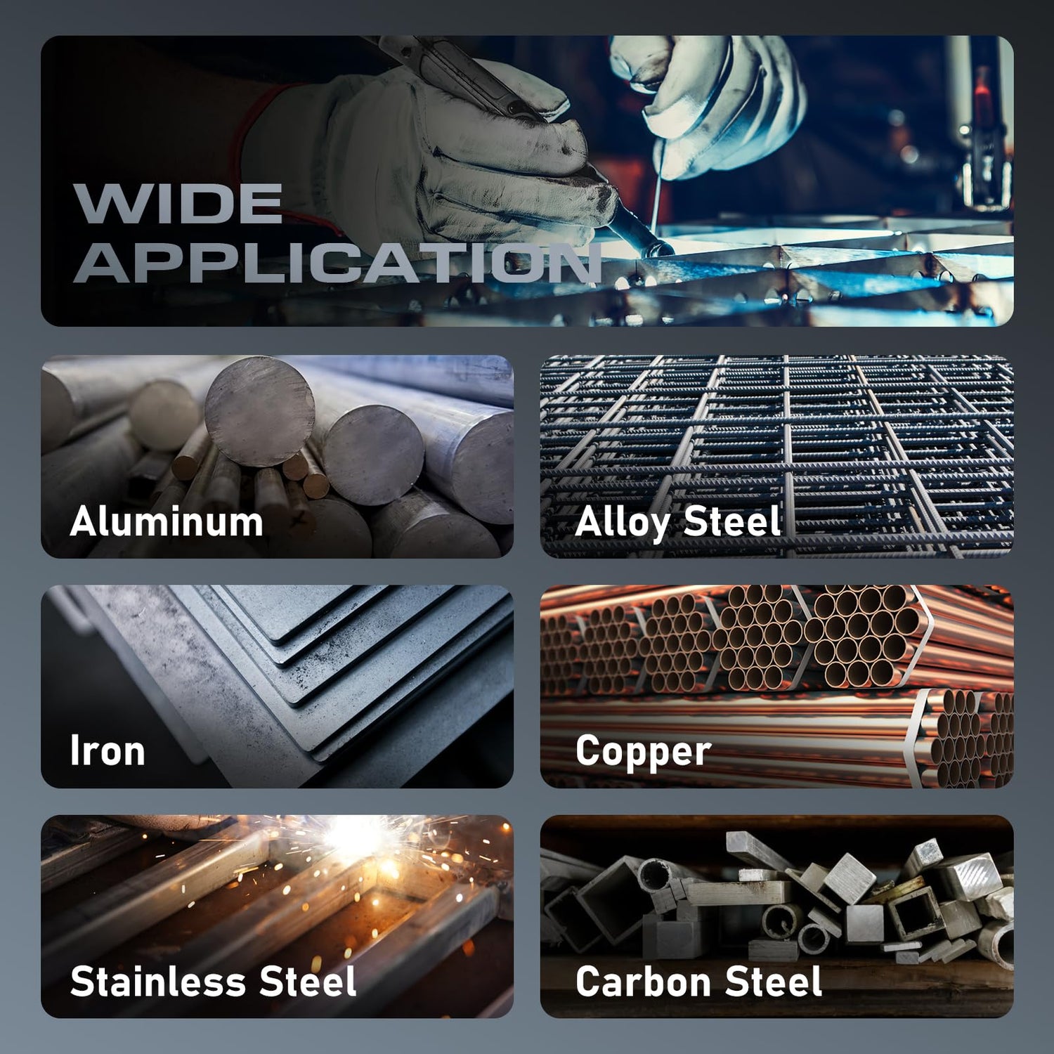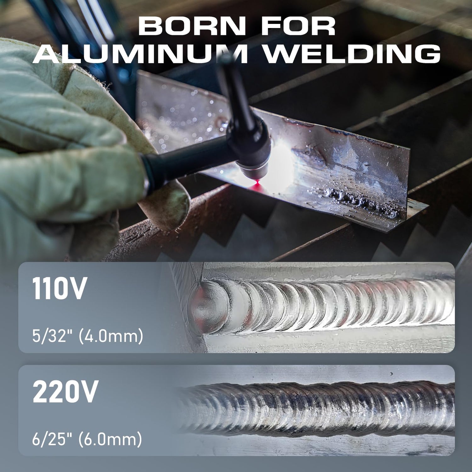 - 【Aluminum TIG Welder】Capable of welding most metals including Aluminum, Alloy Steel, Copper, Stainless Steel, Carbon Steel and Iron, as well as precision welding of thinner materials. For Aluminum, the max welding thickness is 5/32"(4mm) @ 110V and 6/25"(6mm) @ 220V.