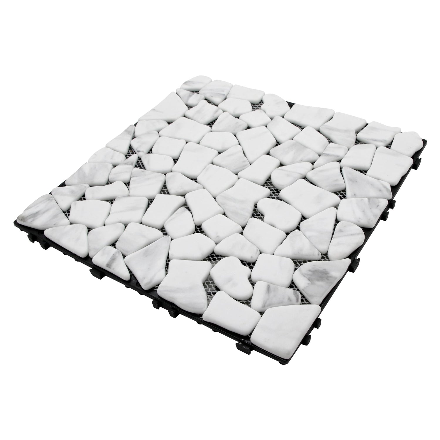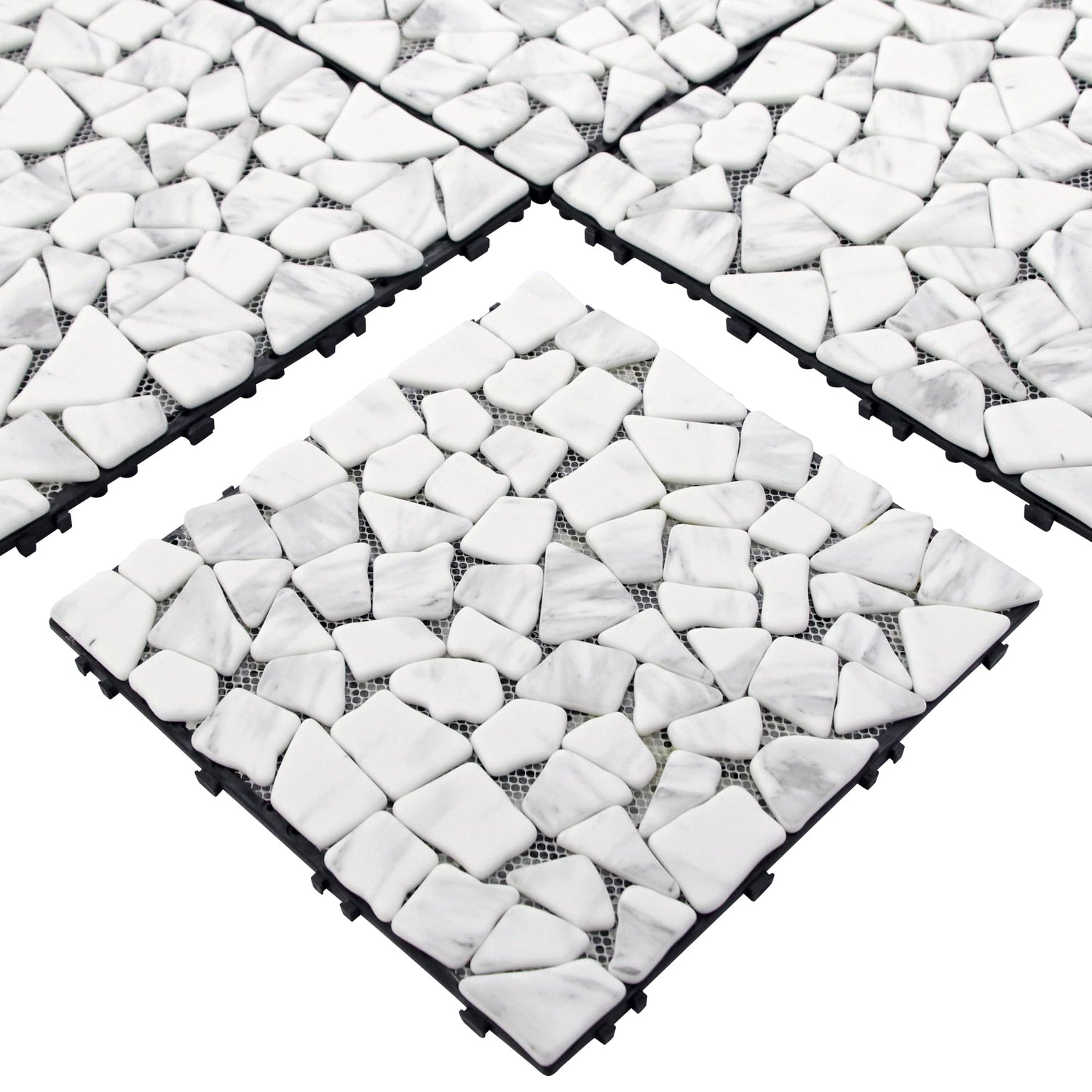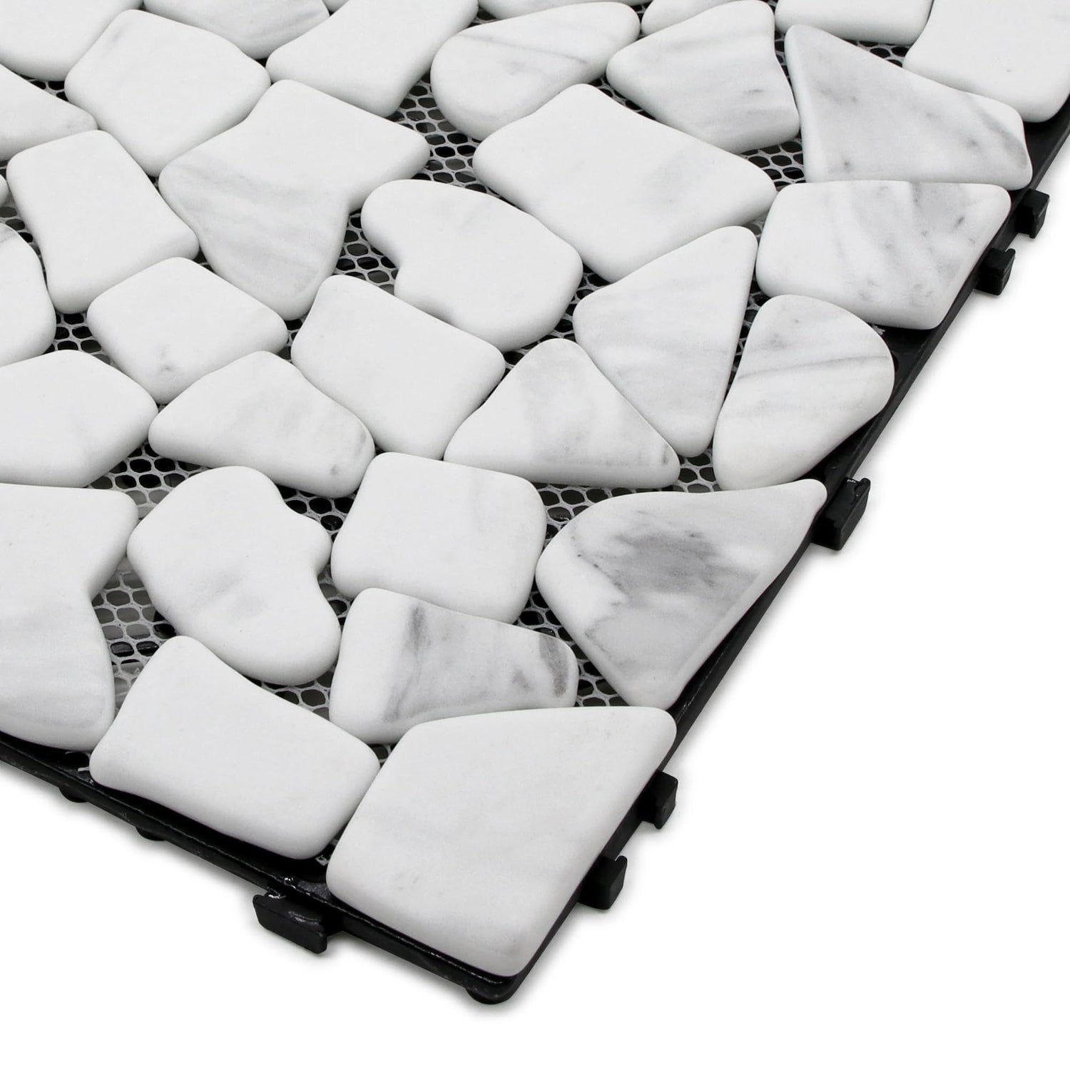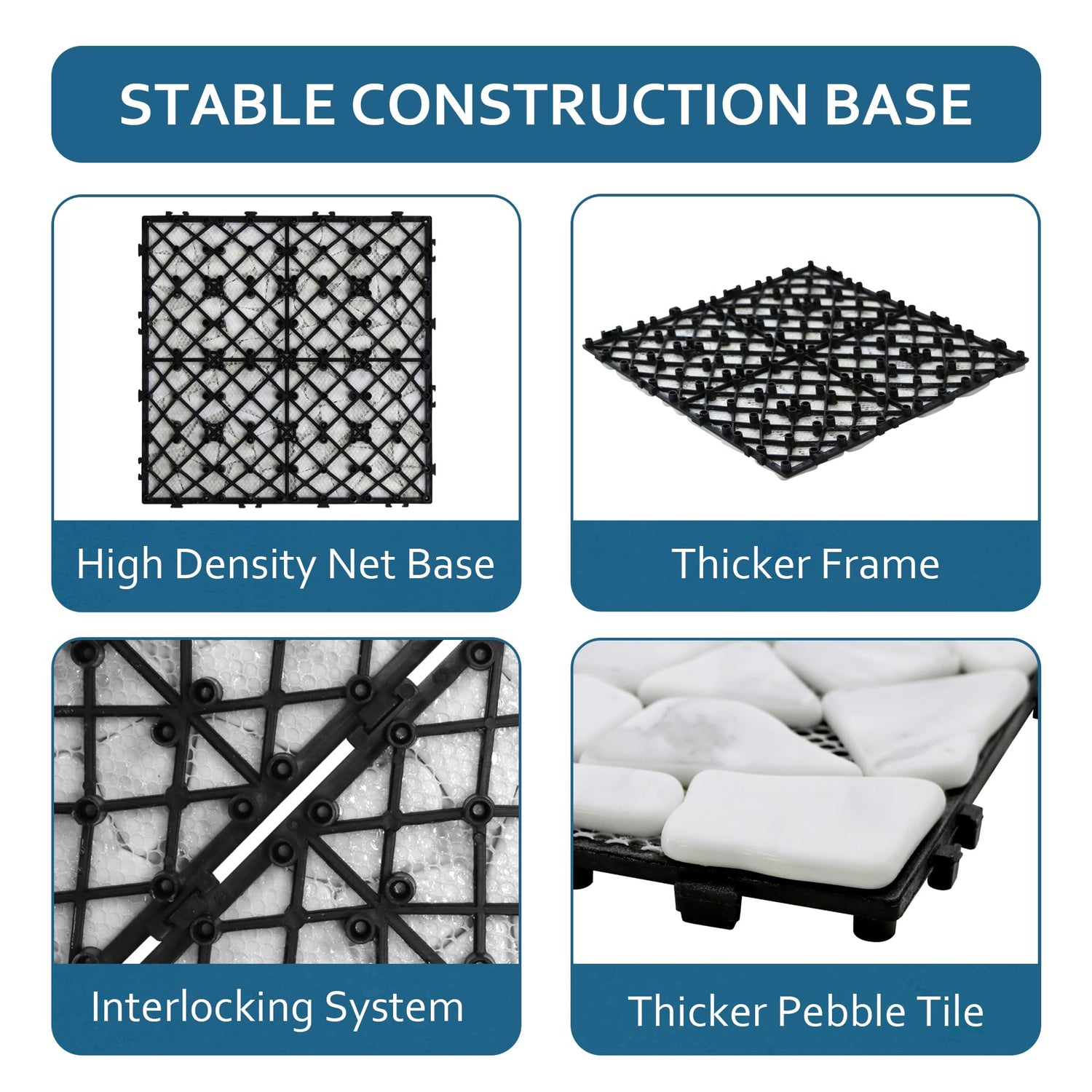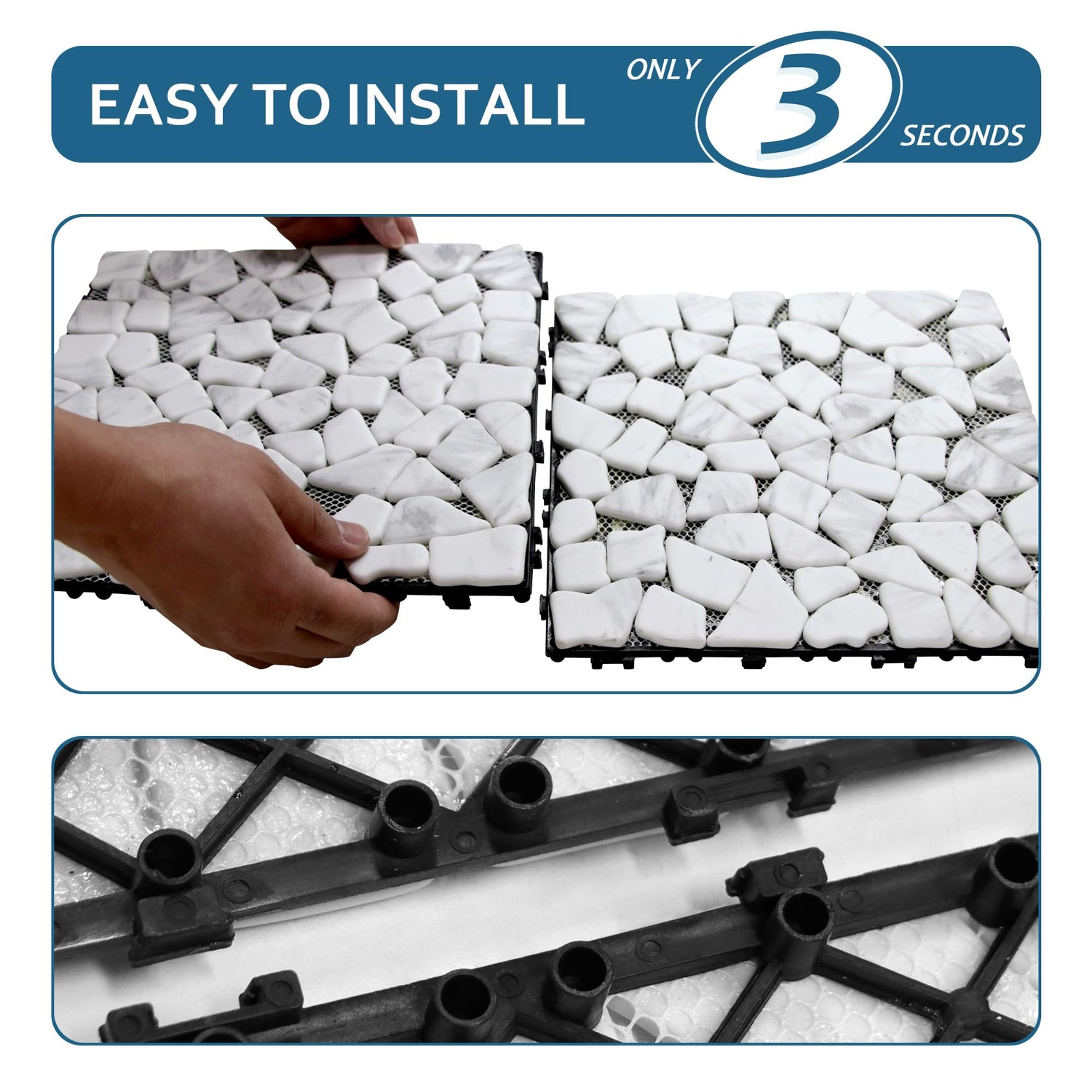 SUNWINGS 4PCS Natural Stone Interlocking Deck Tiles 12"x12" Pebble Waterproof Patio Deck, Outdoor Indoor Floor Decking Tiles for Porch Poolside Balcony Backyard, Carrara White