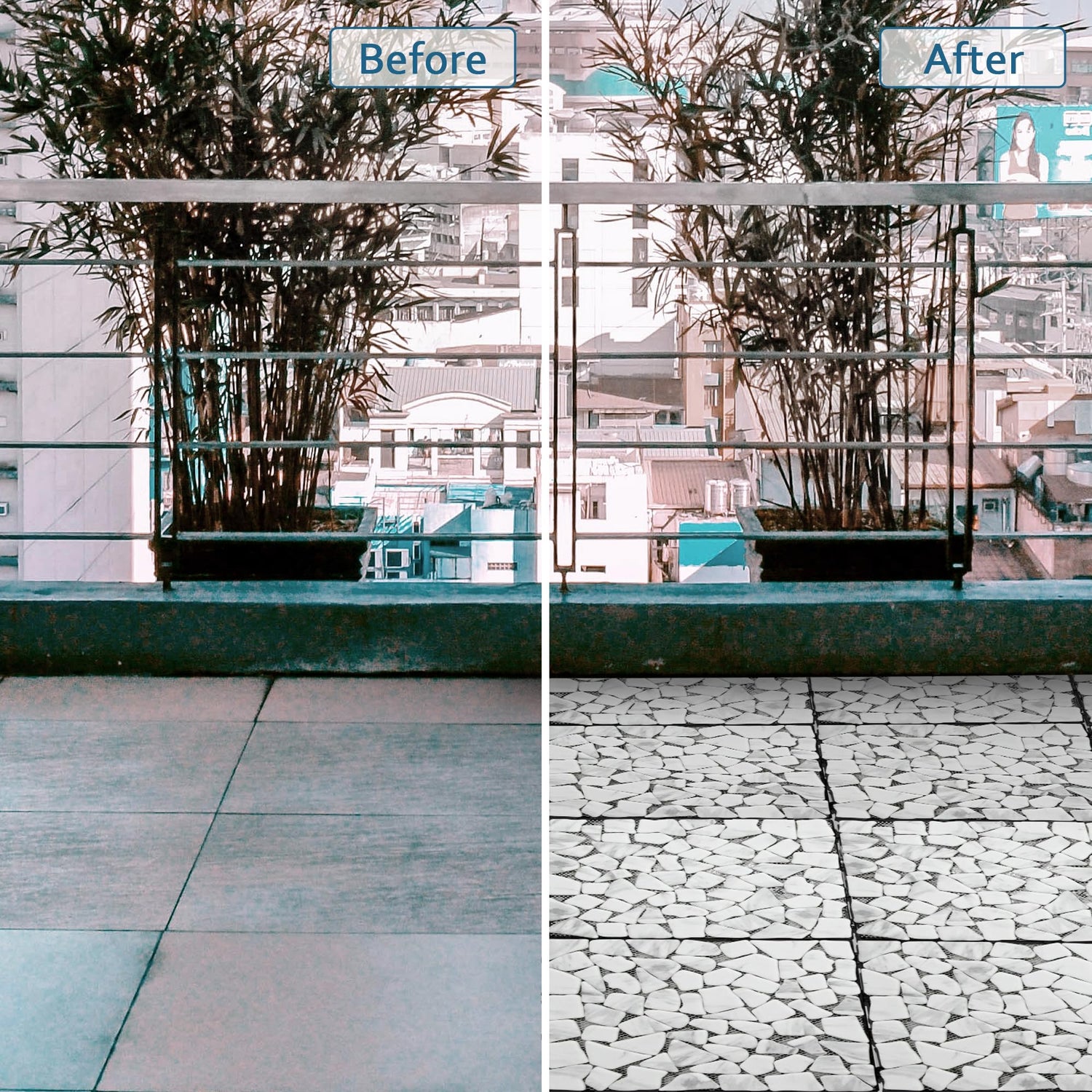 - ๐๐๐๐๐ผ๐บ๐ถ๐๐ฎ๐ฏ๐น๐ฒ & ๐ช๐ถ๐ฑ๐ฒ ๐จ๐๐ฎ๐ด๐ฒ - Outdoor or Indoor use. These patio tiles are waterproof and slip resistant and are ideal for your deck, garden, patio, balcony, lawn, backyard, porch, basement, boat, poolside, roof top deck, pathway, gazebo, outdoor kitchen, fire pit area, covered patio, playground flooring outdoor, outdoor shower or bathroom. This deck flooring can be installed on top of concrete, wood, grass or any other flat surface.