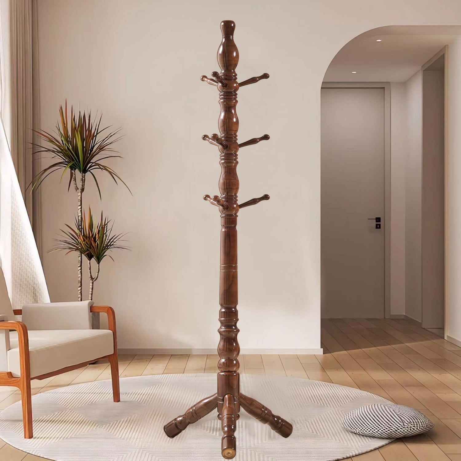 - 【Sturdy and Stable Structure.】This durable coat tree made with a 3.0” thick, solid wood pole and an 18.5” diameter tri-legged base was designed with stability and sturdiness in mind.