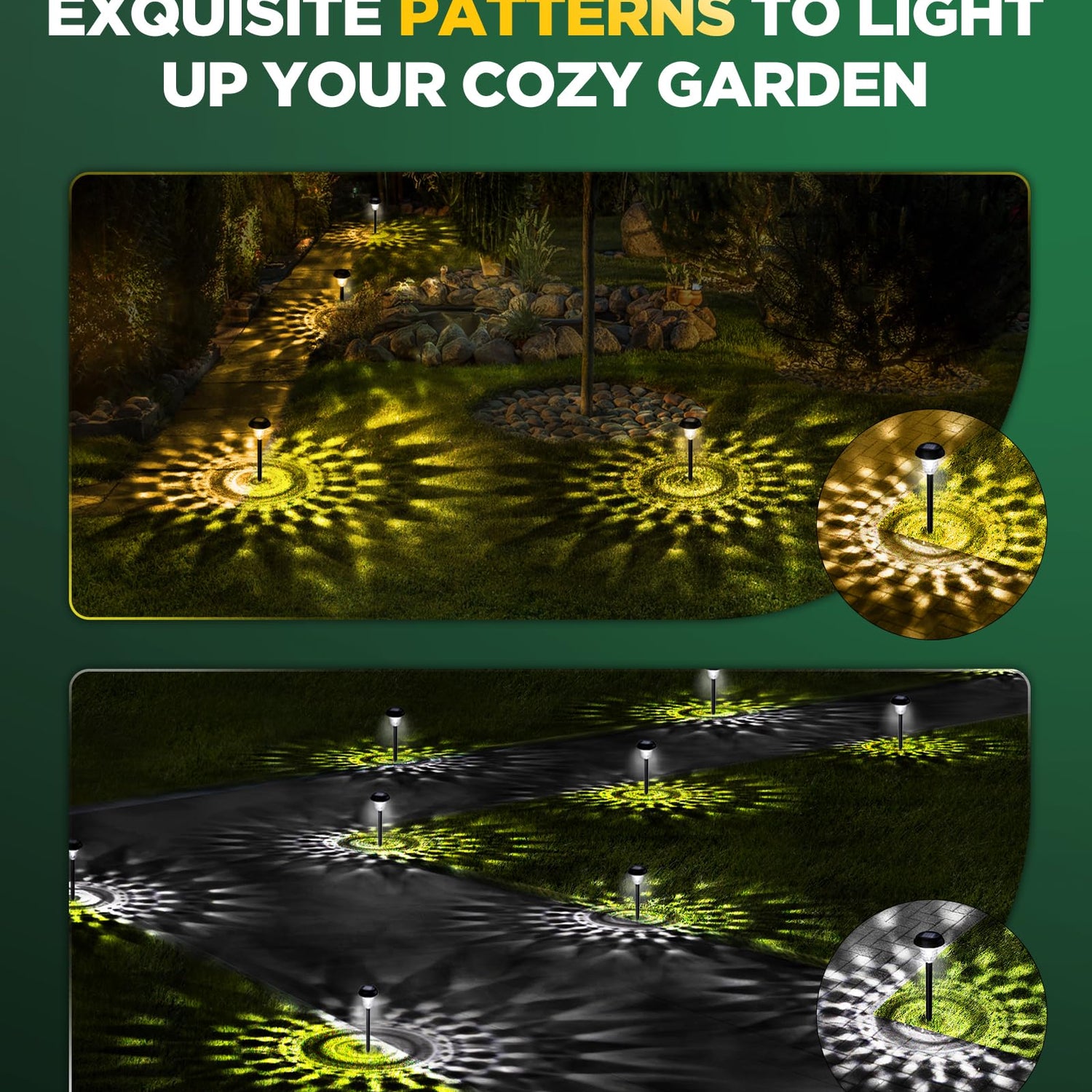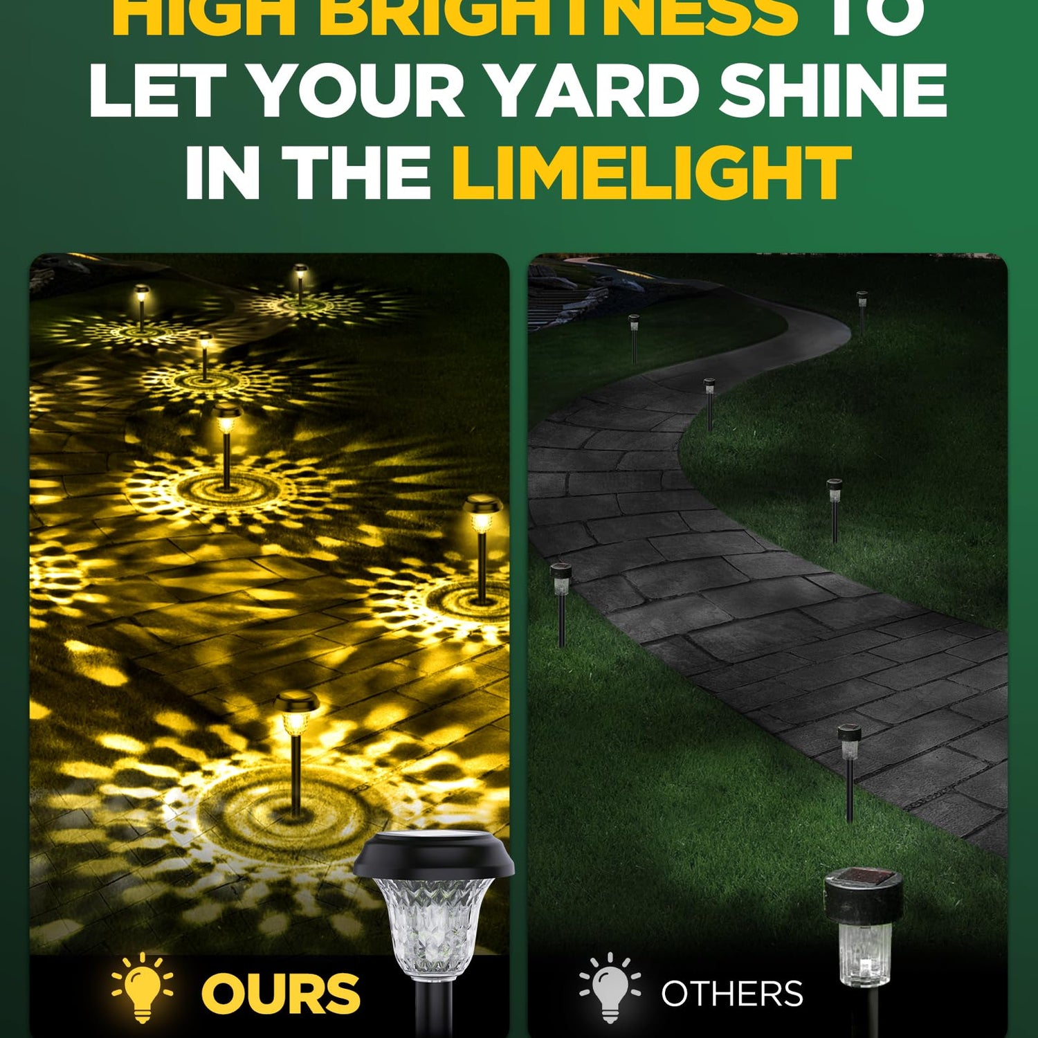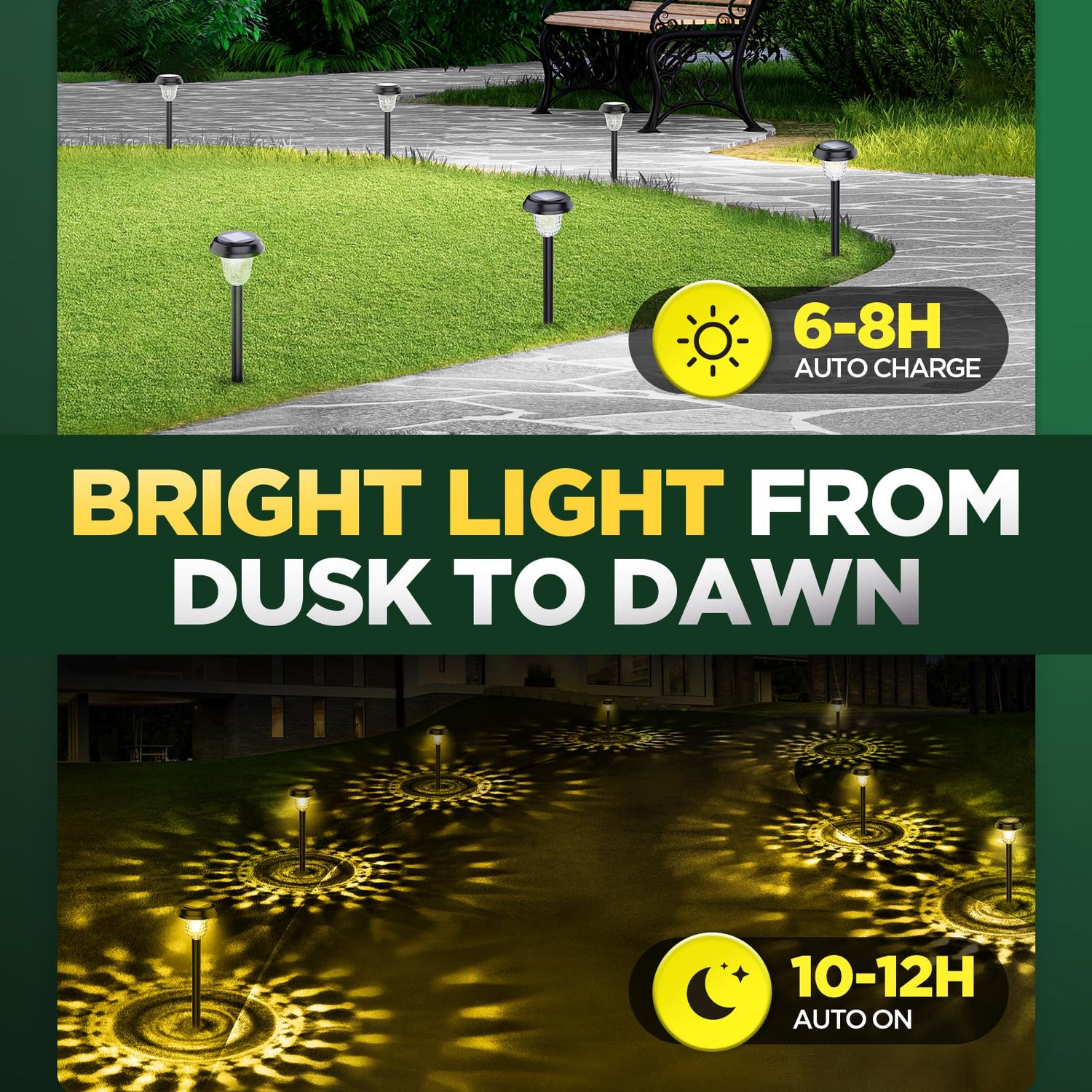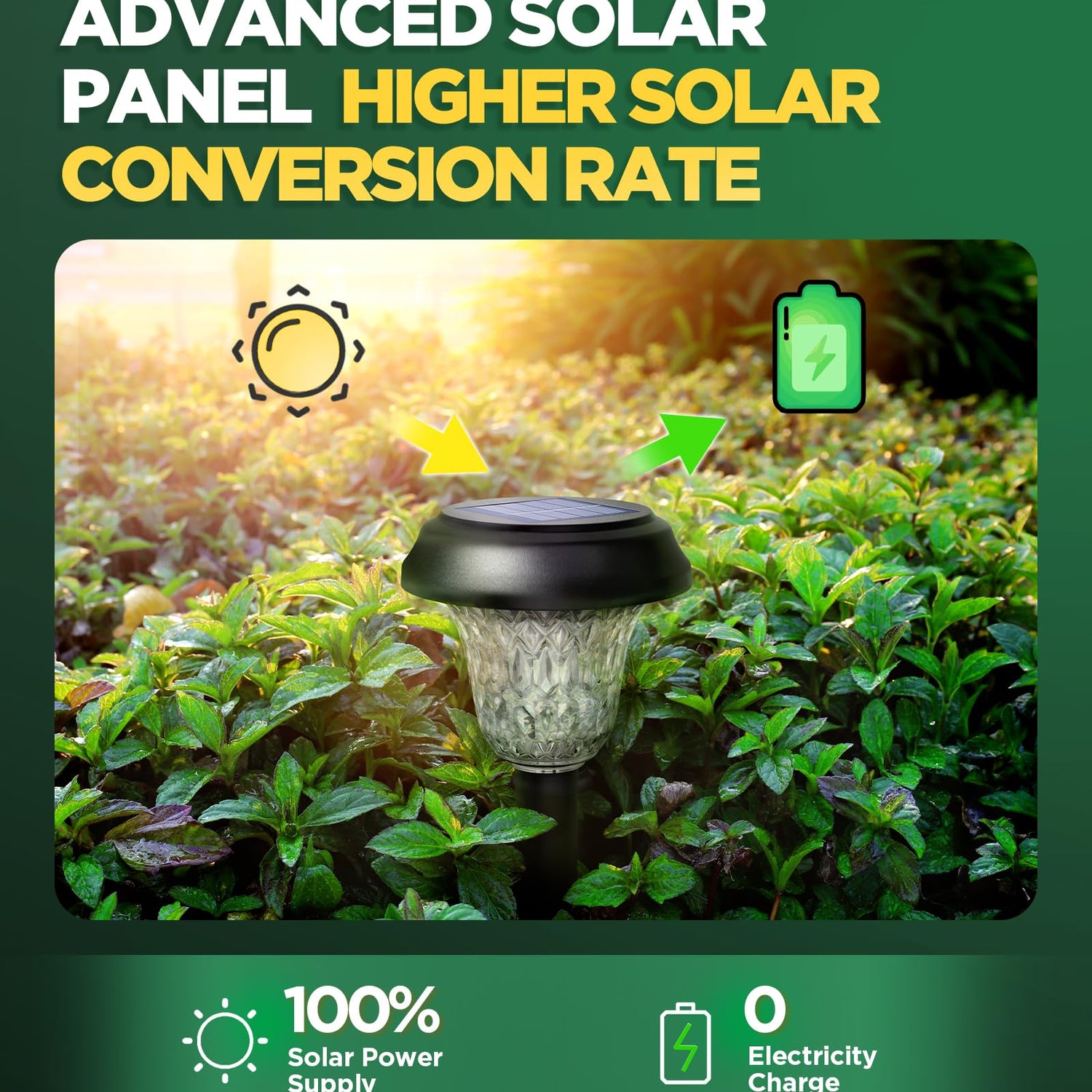 - UP TO 12H OF ALL-NIGHT LIGHTING! Featuring enlarged solar panels and high-capacity batteries, our solar lights outdoor boast a conversion efficiency 1.5X higher than other solar lights. The solar outdoor lights effectively absorb more sunlight and convert it into electricity, charging rapidly even on overcast days. With just 6-8 hours of sunlight charging, our outdoor lights for yard can illuminate your garden for up to 10-12 hours, ensuring your outdoor enjoyment is not limited by darkness.