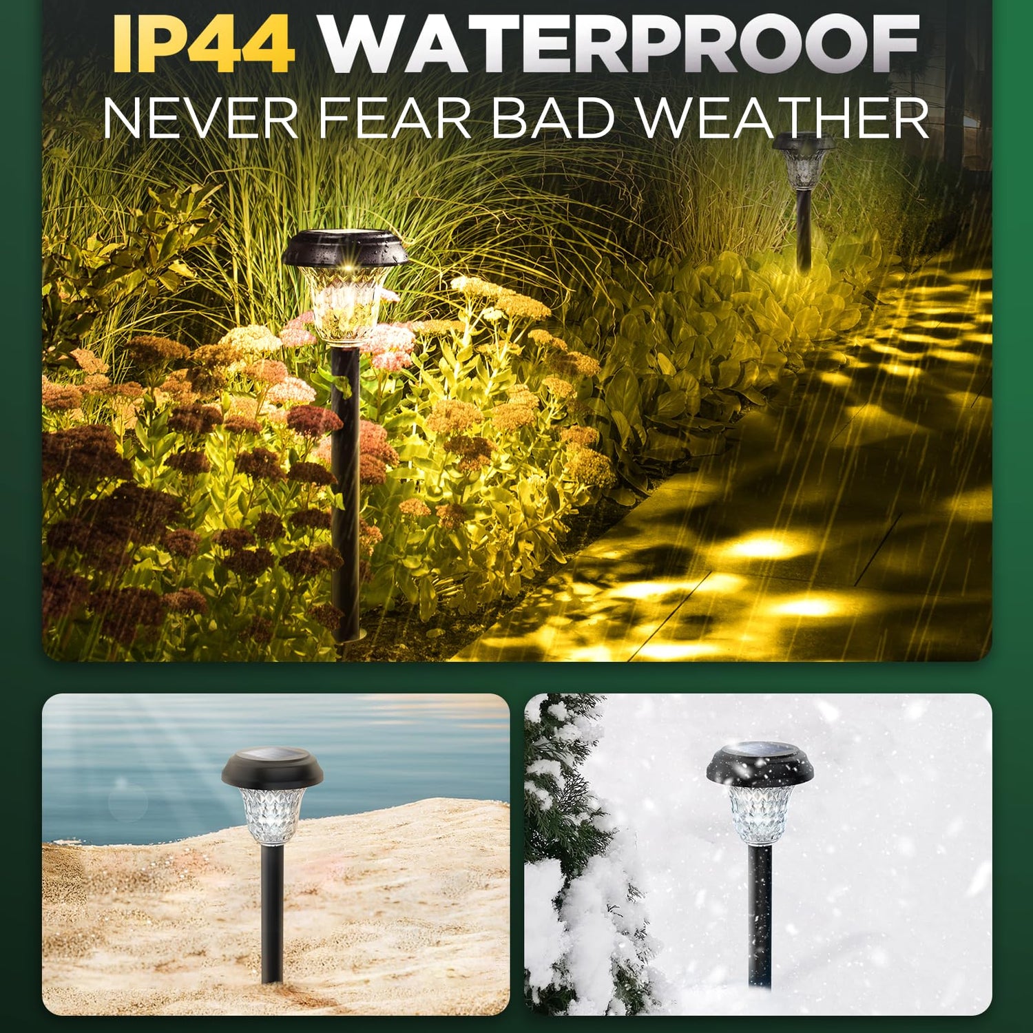 - ALL-WEATHER BRILLIANCE: UNMATCHED PERFORMANCE AND DURABILITY! Thanks to premium corrosion-resistant materials, our solar lights for outside are able to endure the ambient temperatures from -20℉ to 60℉, promising stable performance in scorching or freezing weather. With an IP44 waterproof rating, our solar pathway lights outdoor allow you to enjoy bright illumination anywhere like gardens, yards, courtyards, pathways, lawns, or sidewalks. Don't worry about heavy rain or snowstorms.