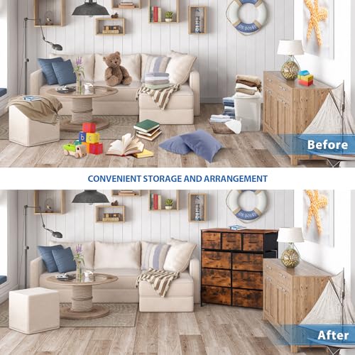 SUPER DEAL Dresser for Bedroom Fabric Dresser Storage Tower Tall Chest Organizer Unit with 9 Drawers for Living Room Nursery Entryway Closets, Steel Frame, Wood Top Rustic Brown