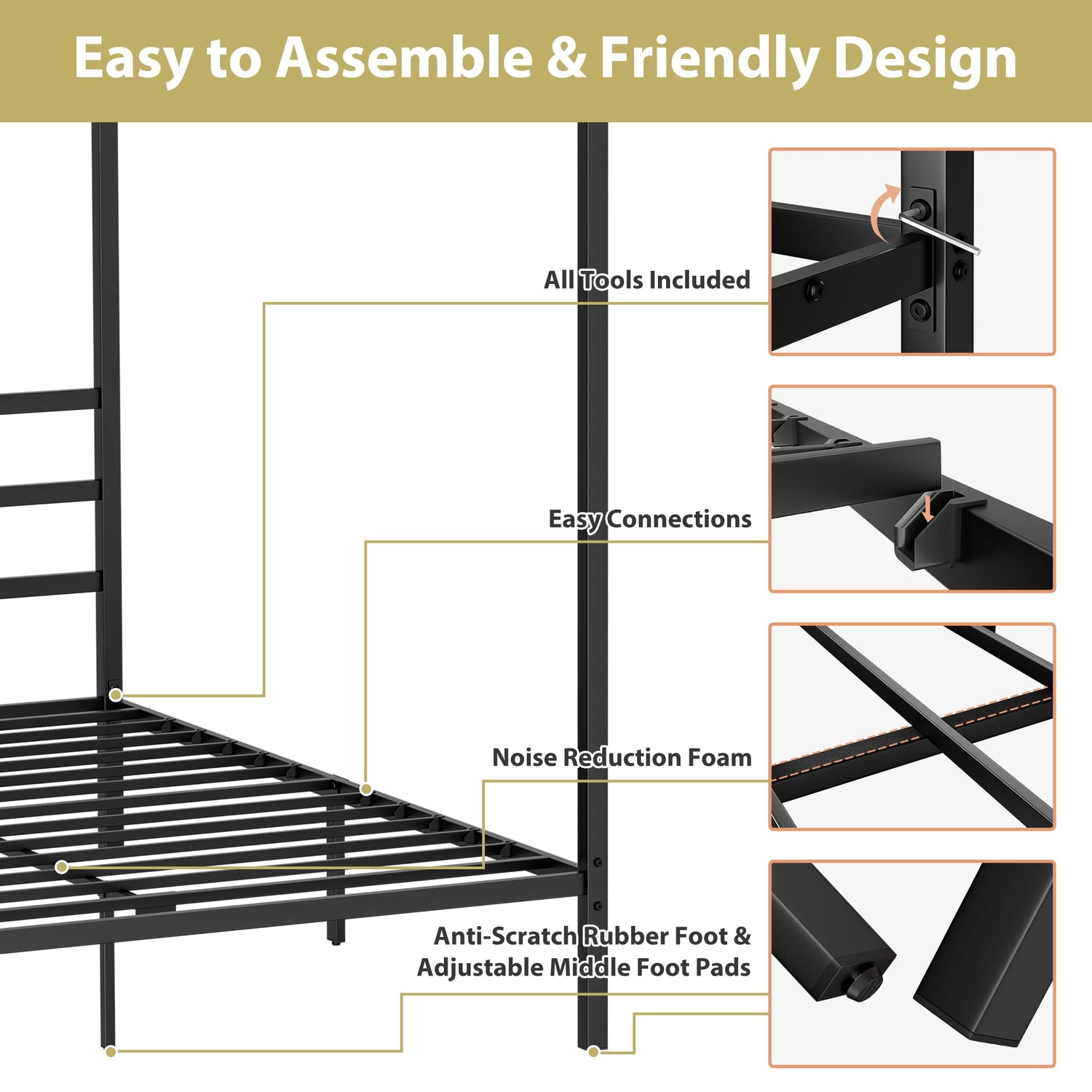 - Minimized Assembly -- Overall Dimensions: 82.4”Length x 60.6”Width x 71.3”Height; Headboard Height: 36"; Can hold up to 800 pounds weight with no concern. No complicated assembly needed, whole assembly can be finished in minutes. Simply unfold the bed frames, connect and tighten the leg supports with pre-assembled wing nuts then use 3 included connectors to combine them together then it’s finished!
