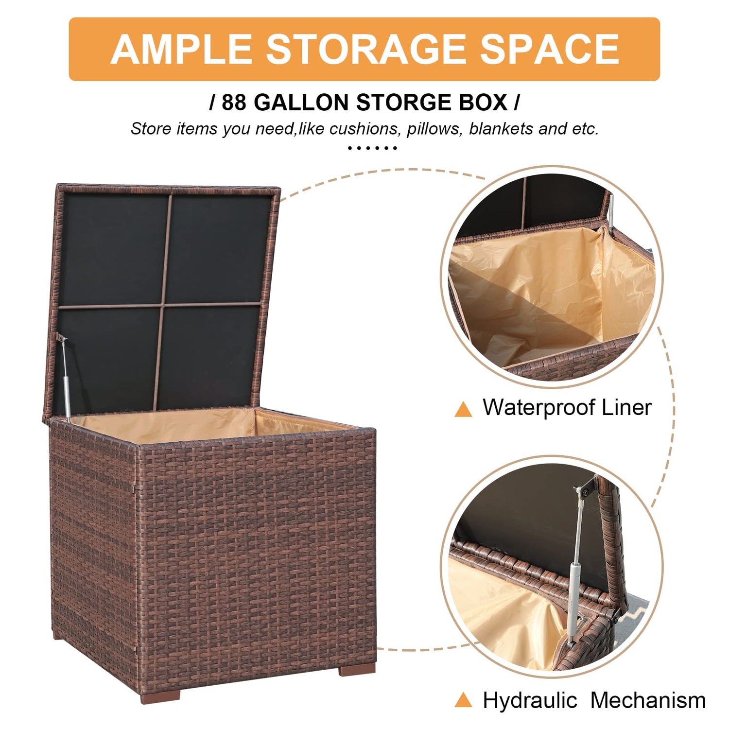 - [Luxurious Set for Upgraded Comfort] The patio furniture sectional comes with 4 corner sofas, 1 single chair, 1 armless single sofa, 2 Ottomans,1 coffee table with tempered glass top, 6 seat and back cushions, 2 ottoman cushions,3 throw pillows and 1 storage box providing relaxation for up to 8 persons.