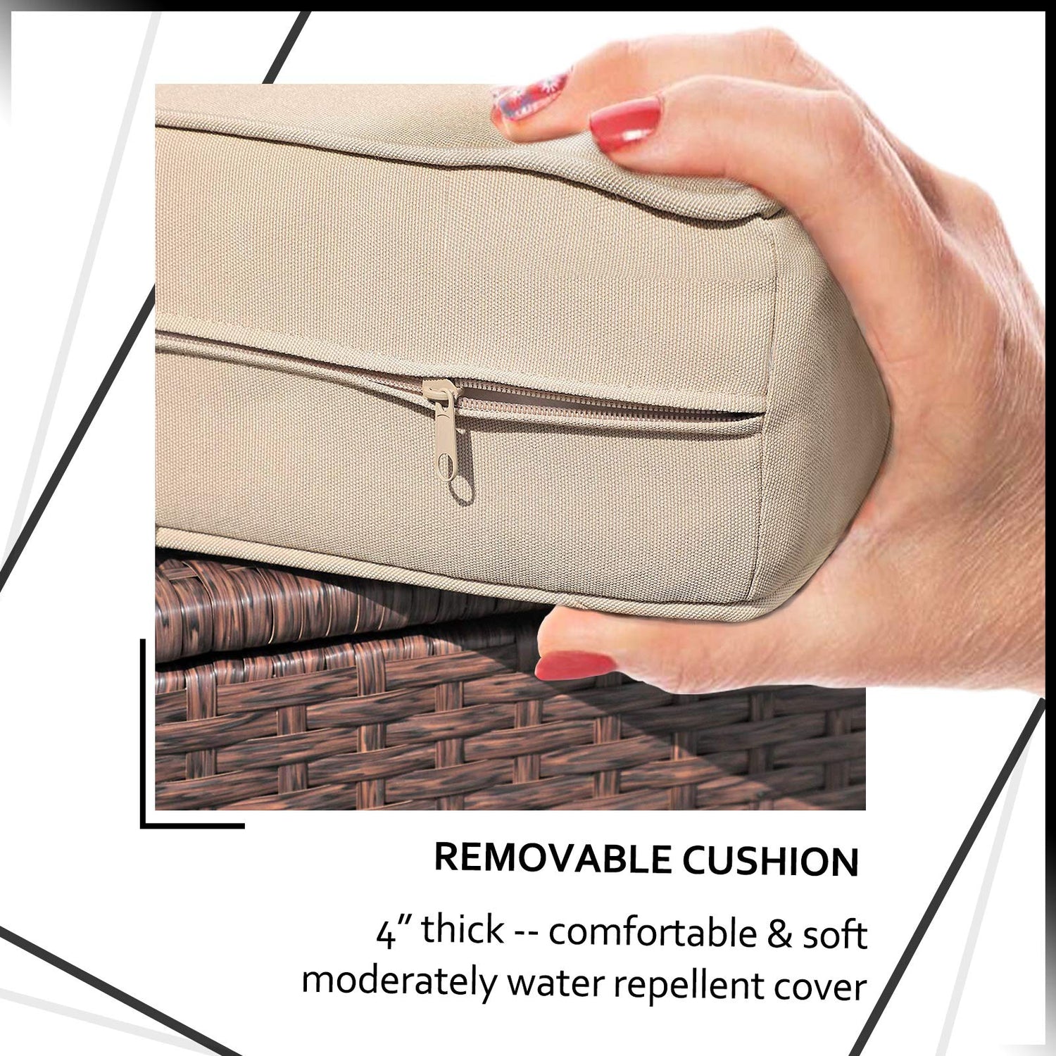 Details: SPECIFICATIONS: -Materials: PE wicker, 250g polyester -Rattan Color: Espresso Brown -Color of Cushion Covers: Beige -Color of Throw Pillows: Red -Weight Capacity of Table: 110 lbs -Weight Capacity of Each Sofa: 250 lbs -Shipping Weight: 152 lbs DIMENSIONS -Coffee Table: 43 x 21 x 15 inches -Single Sofa: 29 x 25 x 28 inches -Corner Sofa: 25 x 25 x 28 inches -Single Sofa without Arms: 19 x 25 x 28 inches -Floor to seat(without cushions): 12 inches -Floor to back top(without cushions): 28 inches -Throw Pillows: 16 x 16 x 6.3 inches -Thick of Seat Cushions: 3 inches -Thick of Ottoman Cushion: 5.5 inches -Thick of Tempered Glass: 0.2 inches PACKAGE INCLUDES -1 x Table with Tempered Glass Top -1 x Arm Single Sofa -4 x Corner Sofa -1 x Armless Single Sofa -1 x Storage Box -2 x Ottomans -6 x Seat Cushions -6 x Back Cushions -2 x Ottomans Cushions -3 x Throw Pillows -6 x Clips -1 x Assembly Manual -1 x Sectional Sofa Connector Manual