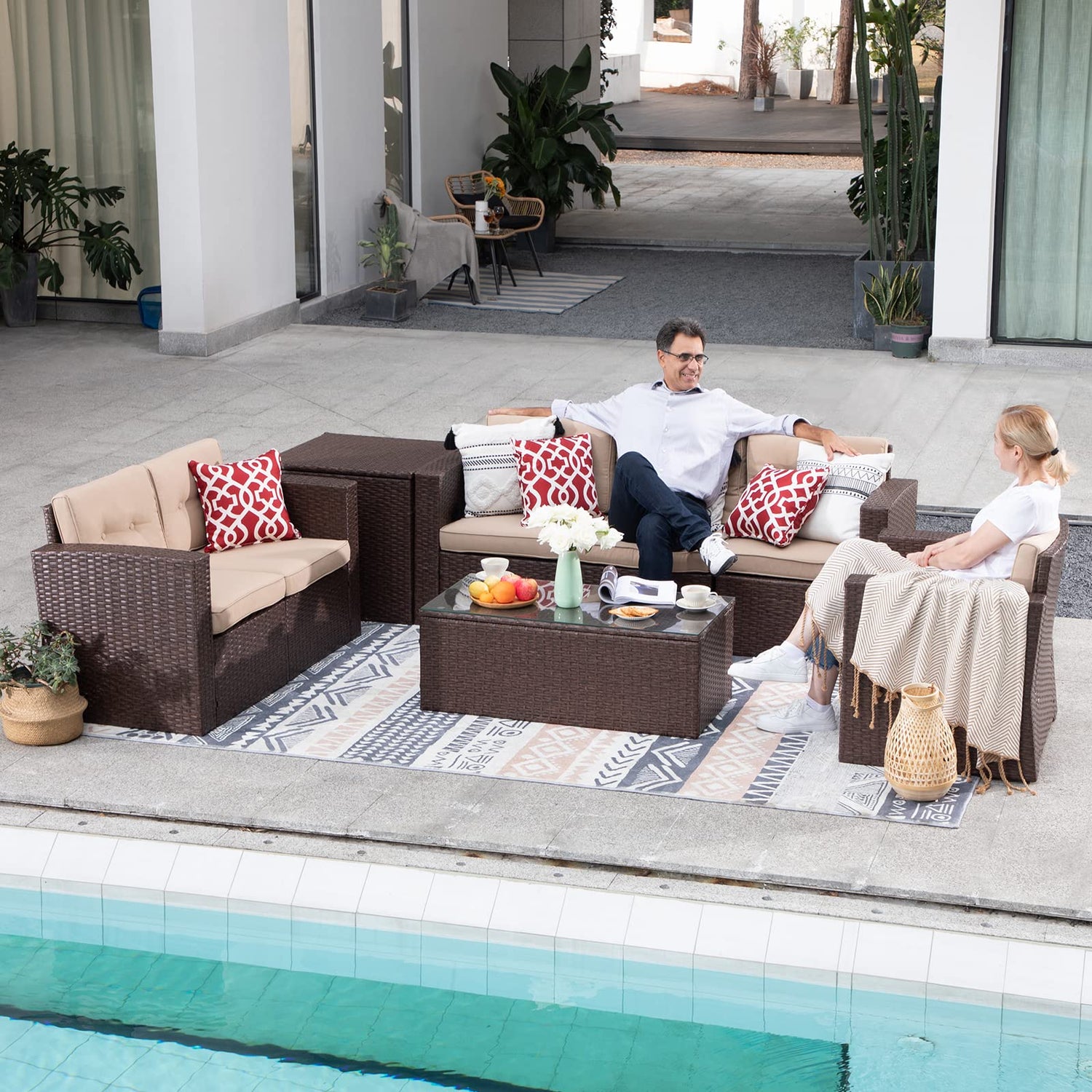 Super Patio 8 Pieces Outdoor Patio Furniture Set, Wicker Patio Conversation Sets with Storage Box, Rattan Outdoor Sectional Sofa Set with Cushions and Coffee Table for Outside Porch, Deck, Brown