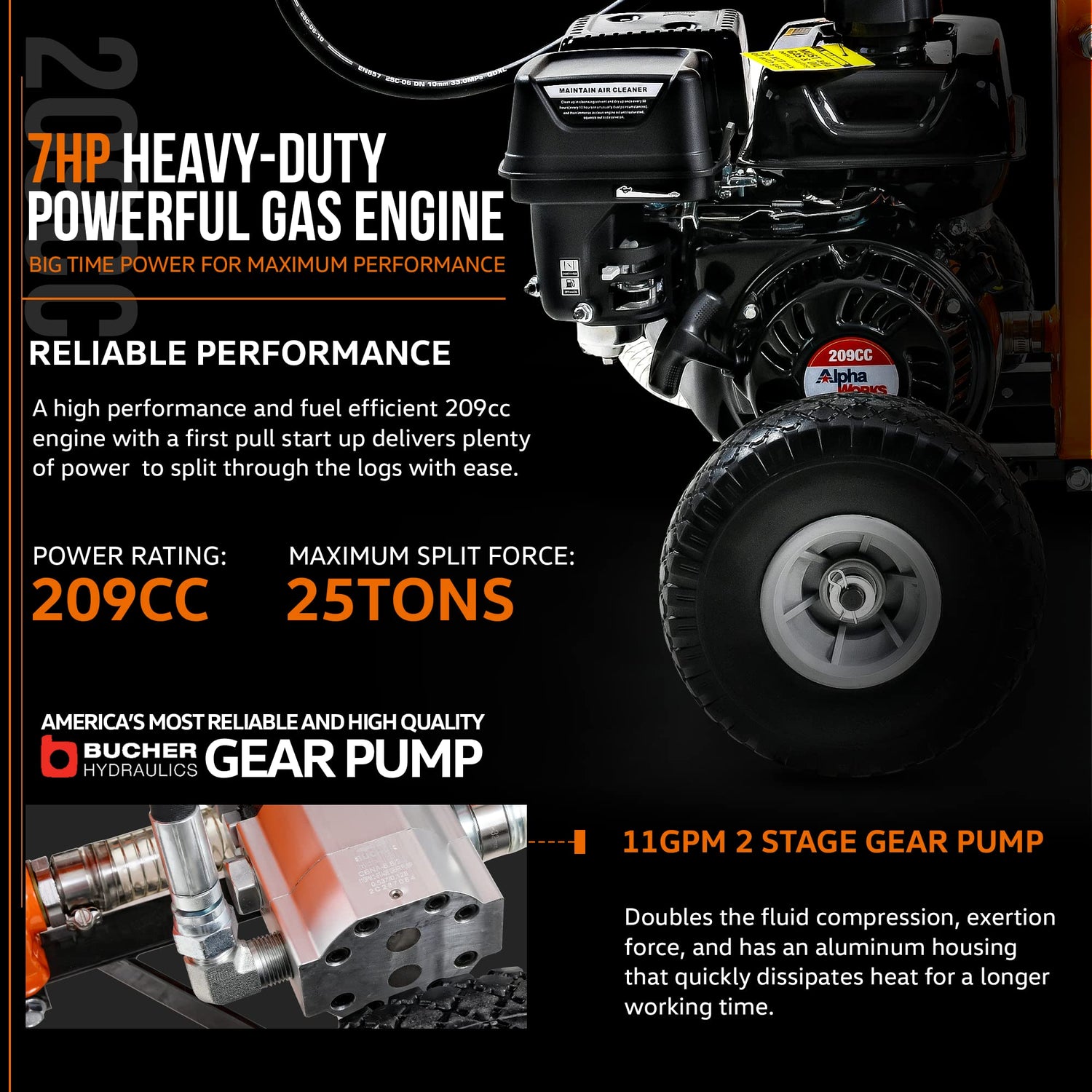 - LOG SPLITTER SPECS - The log splitter is equipped with a 7HP AlphaWorks 4-stroke OHV gas engine and a reliable 2-Stage Bucher Hydraulic Gear Pump. It can split logs up to 20" in length and 16" in diameter in horizontal mode, and logs up to 24" in diameter in vertical mode.